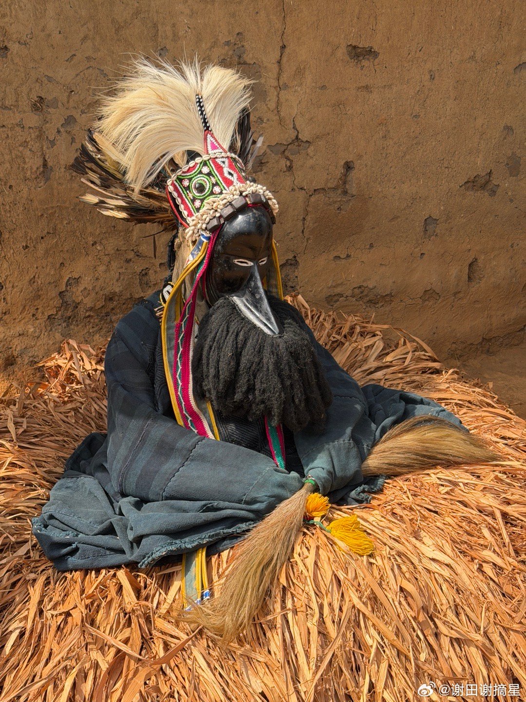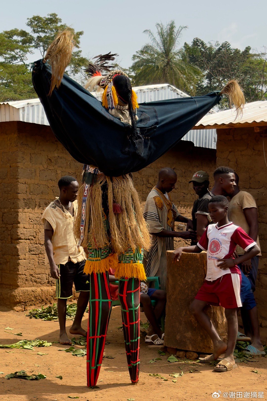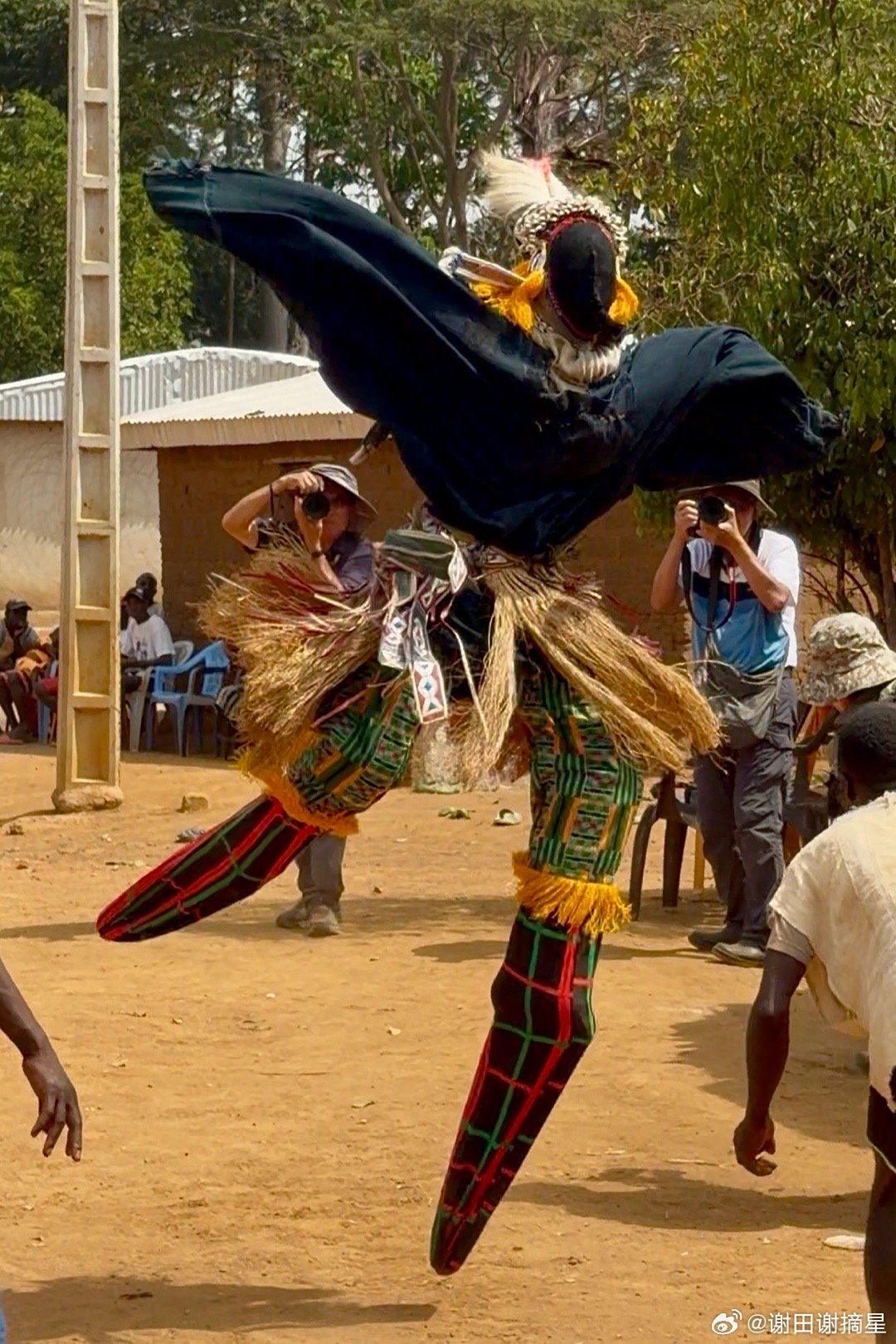 高跷舞和鸟人。科特迪瓦(象牙海岸)Dan族Yakuba人的传统仪式表演高跷舞,当地称为Kwuya Gblen-Gbe,通常在村落庆典、仪式或迎接访客时表演。整个表演从“神圣森林”的边缘开始,象征灵界与人间的连接。先有长时间的女性唱歌和男性舞蹈铺垫,第一个出现的是Ge Gon鸟人,它在Dan族信仰中象征智慧、预知、先知和连接天地(鸟能飞翔,传递祖先信息)。Dan族相信面具不是简单道具,而是活的灵,舞者通过梦境被灵选中,穿上面具后就成为那个灵,讲灵语(旁人需翻译)。鸟人在仪式时先从森林出现,驱散邪灵,再召唤高跷主灵。主灵踩着木制高跷出场,全身装饰,面蒙黑布。高跷象征“升天”和“连接人间与灵界”。能当主灵的人必须经过严格而秘密的仪式,他的亲朋好友,甚至妻子都不应该知道他是主灵的扮演者。主灵的标识动作是跳着转圈,这是很危险的动作,用于展示强大的灵敏和力量。它边舞边发出尖锐、怪异的叫声,这是在模拟祖灵说话,旁人难以听懂,只有解说者能翻译。合影时候在我和高跷主灵之间的,就是人间的解说者。谢田的环球足迹