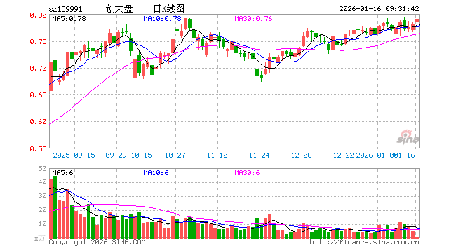 1月16日,创大盘ETF(159991)开盘涨0.38%,报0.784元。创大盘ETF(159991)重仓股方面,宁德时代开盘涨1.20%,中际旭创涨1.75%,东方财富涨0.96%,新易盛涨2.53%,阳光电源涨1.44%,胜宏科技涨1.04%,汇川技术涨0.41%,迈瑞医疗涨0.21%,亿纬锂能涨0.53%,同花顺涨1.68%。