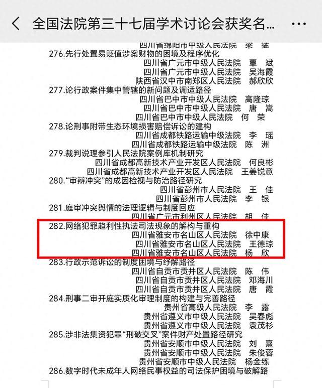 由雅安市名山区人民法院徐中康、王德琼、杨欣撰写的《网络犯罪趋利性执法司法现象的解构与重构》获全国法院第三十七届学术讨论会获奖论文优秀奖。