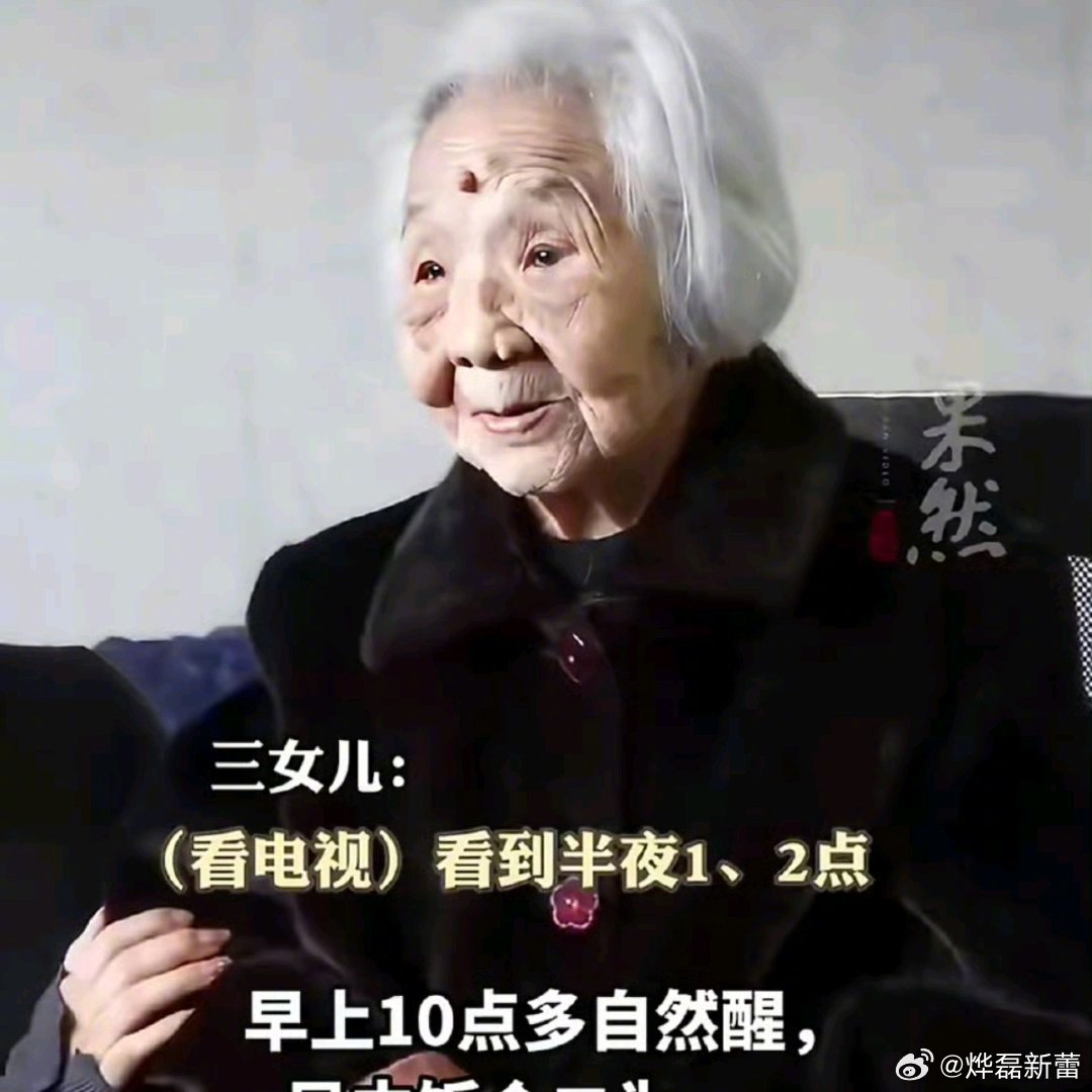 101岁奶奶每天熬夜追剧到凌晨2点【家人回应101岁老人熬夜追剧到凌晨2点 家庭和睦,不内耗,难得糊涂,绝对可以一家人都可以长寿,但凡家里有个内耗的人,全家人都痛苦,都不得安宁,你自己心态怎么能好呢? 另外一个看淡一切,不争不抢,不以物喜。不以己悲。争名夺利最后都是一场空,活得久才是王道, 长寿最重要的并不是吃什么,而是在于心境。所有长寿老人在饮食和作息上可能会有差别,但无一例外都是心态好积极乐观的老人,没有一个是满脑子负能量动不动内耗、喜欢与人争执的和人争吵的。 我记得有个专家说过,不管是早睡还是晚睡,只要生活作息规律,睡眠充足就不要紧,他虽然晚睡,但长期是这个作息呀