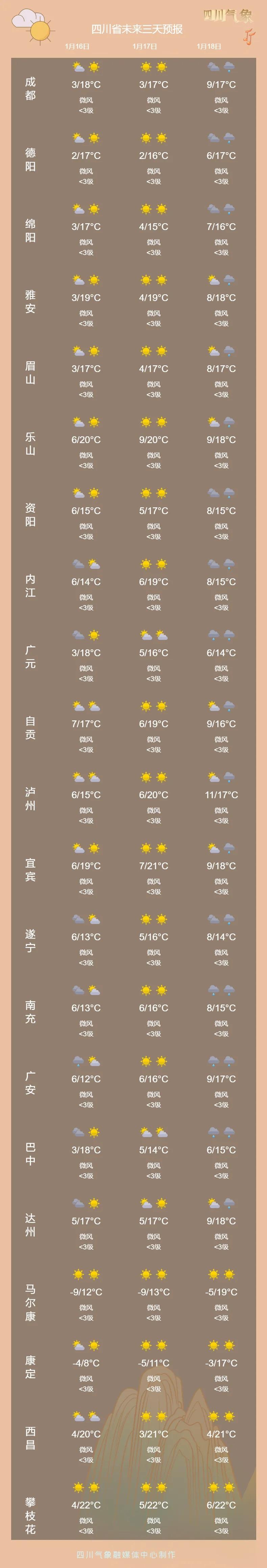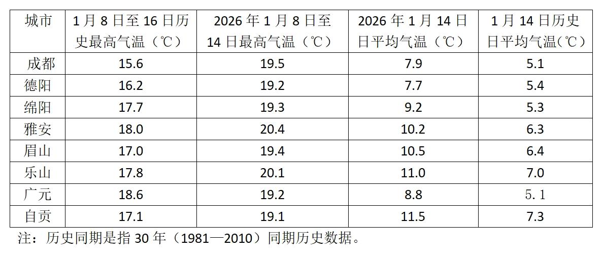 截至2026年1月14日,今冬“三九”期间实况气温创新高的部分四川城市。数据