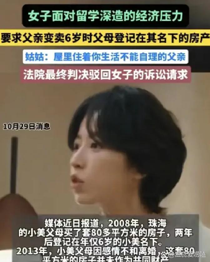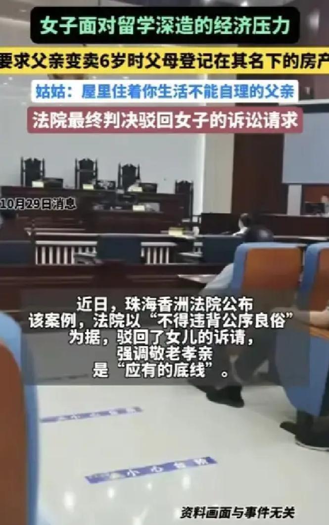 寒心!珠海女子为留学卖房款,把脑梗父亲告上法庭,法院判决大快人心 都说血浓于水,可广东珠海这桩家事,看得人脊背发凉! 一名女子为了凑出国留学的费用,竟要把行动不便的脑梗父亲扫地出门,协商无果后,直接将父亲和照料他的姑姑告上了法庭。 这房子到底是谁的?为啥女儿能如此理直气壮? 事情得从2008年说起。当年女子父母买下这套80多平的房子,2010年办房产证时,直接登记在了年仅6岁的女儿名下。 可也是在这一年,意外降临——父亲突发脑梗,开颅手术后捡回一条命,却落下二级伤残,左胳膊左腿完全不听使唤,生活根本无法自理。 从那以后,这套登记在女儿名下的房子,就成了父亲的安身之所。老家务农的姑姑放心不下弟弟,常年奔波过来照料,洗衣做饭、翻身擦背,日复一日从没间断。 2013年父母离婚,房子没被分割,依旧在女儿名下。女孩跟着母亲生活,渐渐和父亲疏远,探望的次数越来越少。 后来女子出国读完本科,想继续深造,可家里经济拮据,凑不出学费。这时她突然想起,自己名下还有一套房。 在她看来,房子是自己的,卖掉换学费天经地义。可她忘了,房子是父母出资购买,当年登记在她名下只是父母的爱;更忘了,里面住着的是无房可住、没钱租房的病重父亲。 她找到父亲和姑姑协商卖房,父亲哭诉自己搬走就没地方落脚,姑姑也再三解释只是来照顾弟弟,绝非占房。可女子眼里只有留学梦,协商彻底谈崩。 最终,她铁了心一纸诉状,要求父亲和姑姑腾退房屋。 庭审现场压抑得让人窒息,一边是白纸黑字的房产证,一边是血浓于水的亲情与赡养义务。 好在法院的判决守住了底线!法院驳回了女子的诉求,明确表示:赡养父亲是她的法定义务,房子虽登记在她名下,但系父母出资购买的纯获利财产,不能违背公序良俗把病重父亲赶走。姑姑的照料行为合法合理,并无不当。 宣判后,父亲攥着帽子指尖发抖,一言不发;姑姑默默帮弟弟拉好外套;女子则急促地收拾材料,始终没看父亲一眼,肩膀微微耸动着走出法院。 这事在网上吵翻了天。有人说女子太冷血,学历再高,不懂孝道也是白搭;也有人共情她的留学压力,觉得房子是她的合法财产。 但说到底,房产证能证明物权,却抹不掉血缘和责任。父母倾其所有给孩子铺路,孩子怎能在父母病重时,为了自己的前途断了父亲的生路? 你觉得法院的判决合理吗?如果是你,会怎么平衡留学梦和父亲的安身之所?评论区聊聊!