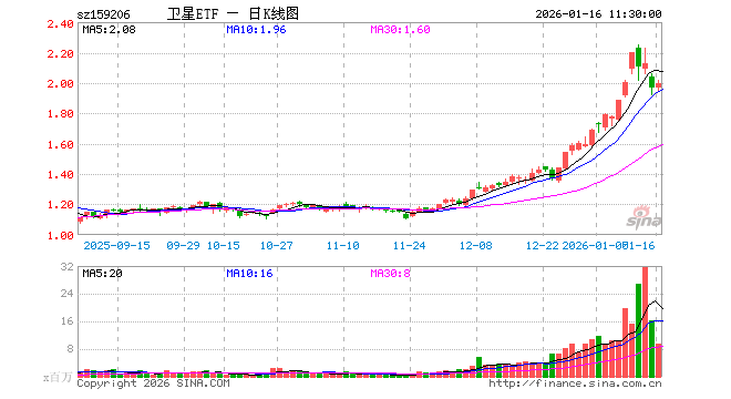 1月16日,截止午间收盘,卫星ETF(159206)涨1.37%,报1.995元,成交额19.05亿元。卫星ETF(159206)重仓股方面,睿创微纳截止午盘跌0.74%,航天电子跌1.53%,中国卫星跌1.71%,复旦微电涨0.12%,上海瀚讯涨3.96%,中兴通讯跌0.45%,华力创通涨0.59%,电科芯片涨3.01%,隆盛科技涨1.37%,振芯科技跌0.28%。