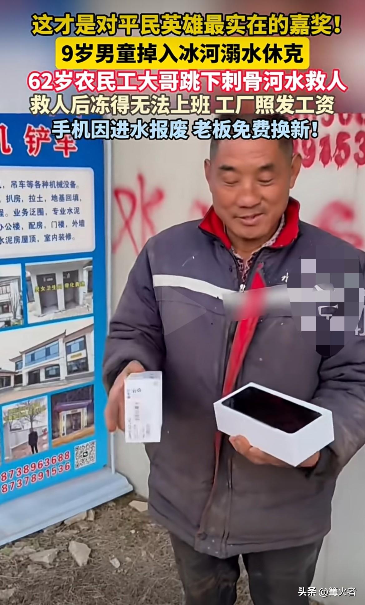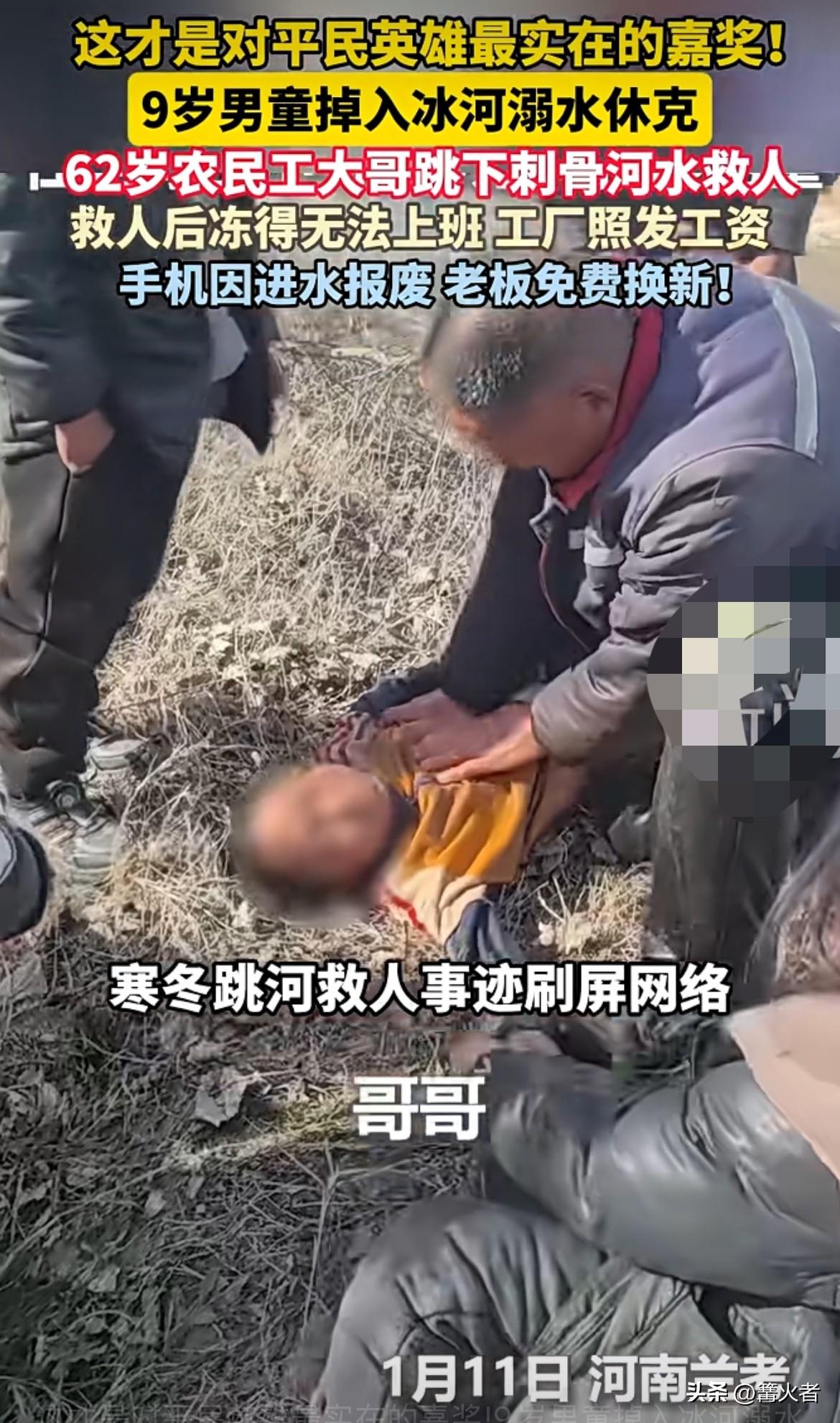 62岁农民工大哥勇救掉进冰河溺水休克的男童,一头扎进那如冰刀般刺骨的河水里。换一般人估计腿软得都站不住,大哥这勇气和善良,超凡脱俗,真是平民英雄! 救人后大哥冻得没法上班,工厂照发工资,手机报废老板免费换新。这工厂老板太人性化了,这是对英雄最实在的嘉奖,让大哥暖心又安心。好人有好报的铁证。希望社会多些正能量,让英雄不寒心!