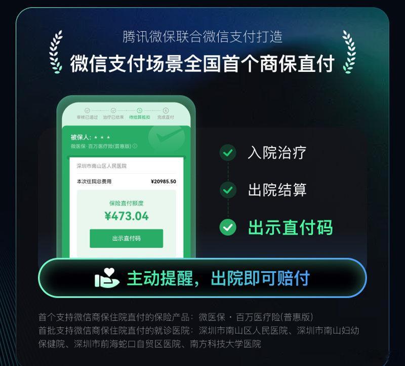 2025年,朝着让理赔越来越简单,直到近乎“无感”的目标进发,持续升级“微保安心赔”在线理赔服务。在医疗理赔方面,腾讯微保联合微信支付,重磅打造微信支付场景内全国首个商保直付快捷通道,首批上线深圳市南山区人民医院等四家深圳本地医院。