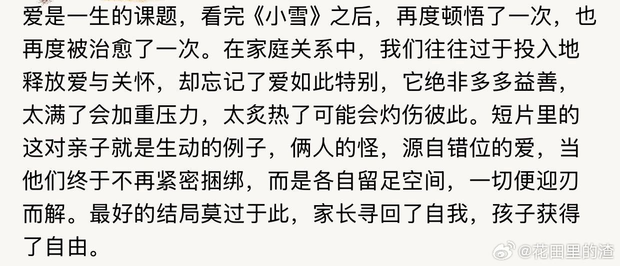 找到了我的亲情内耗疏解指南 看完《小雪》破防了!代际焦虑从不是单方面的难题,一追一躲的拉扯里,藏着两代人说不出的爱。学会让爱呼吸,内耗才会慢慢融化。