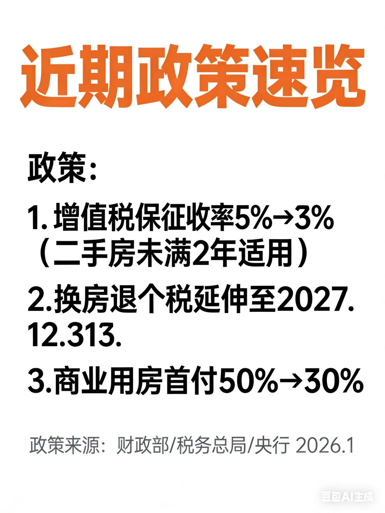 15天出了3个新政策,大家自己品[太阳][太阳][太阳] 1、降低增值税费率:5.3%降到3.18% 2、退个税延期到2027年12月31日 3、购买商业用房最低首付:50%降到30%
