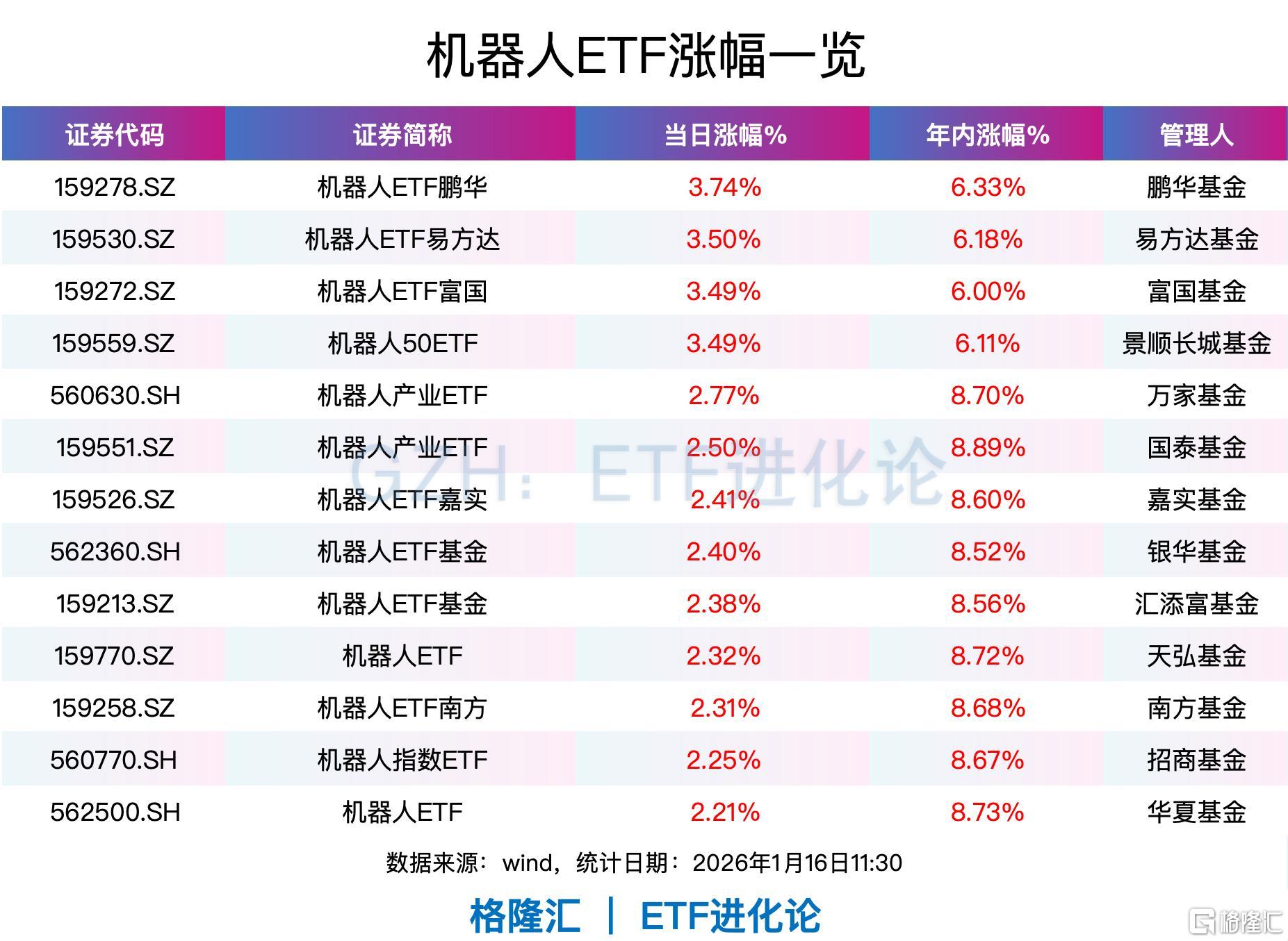 机器人ETF鹏华、机器人ETF易方达、机器人ETF富国、机器人50ETF涨超3%;机器人产业ETF、机器人产业ETF、机器人ETF嘉实、机器人ETF基金、机器人ETF基金、机器人ETF、机器人ETF南方、机器人指数ETF、机器人ETF涨超2%。