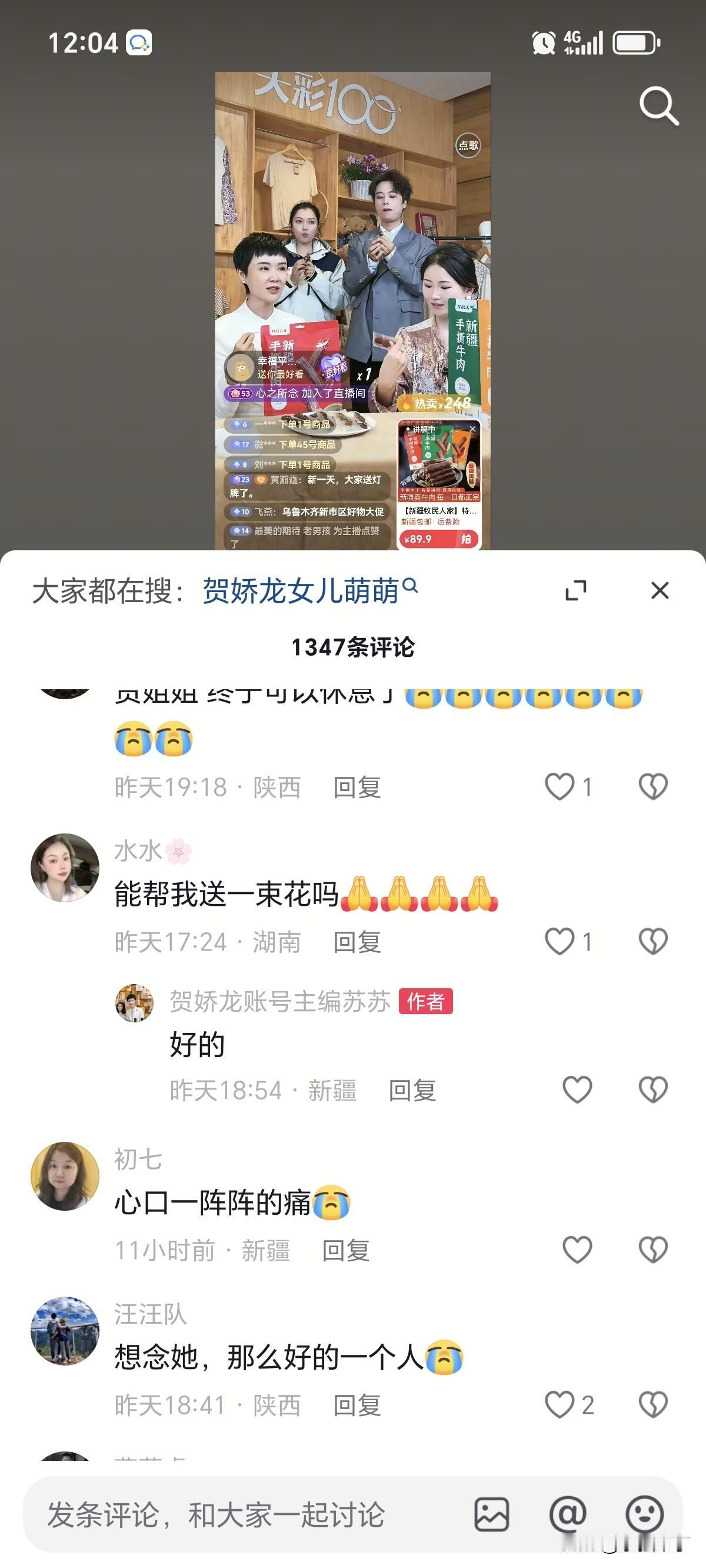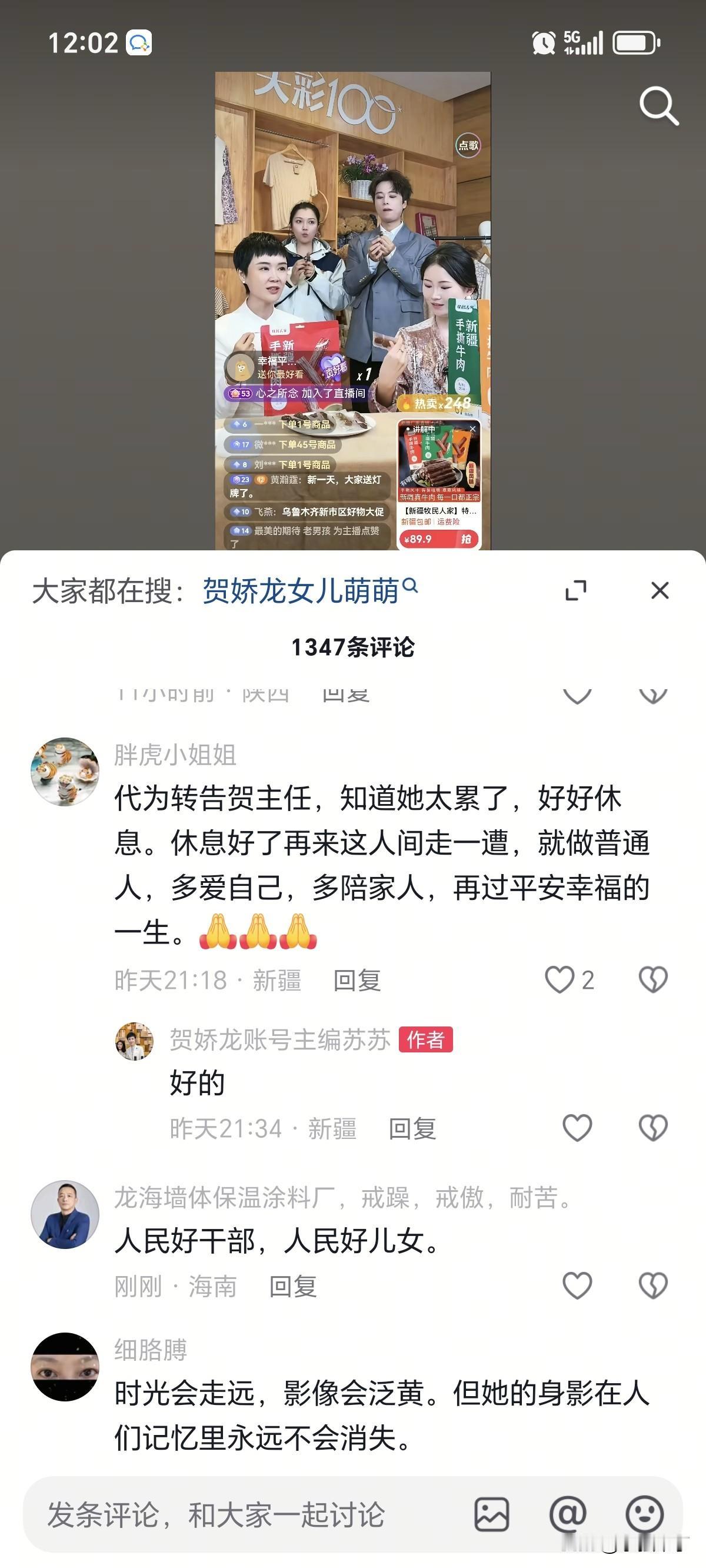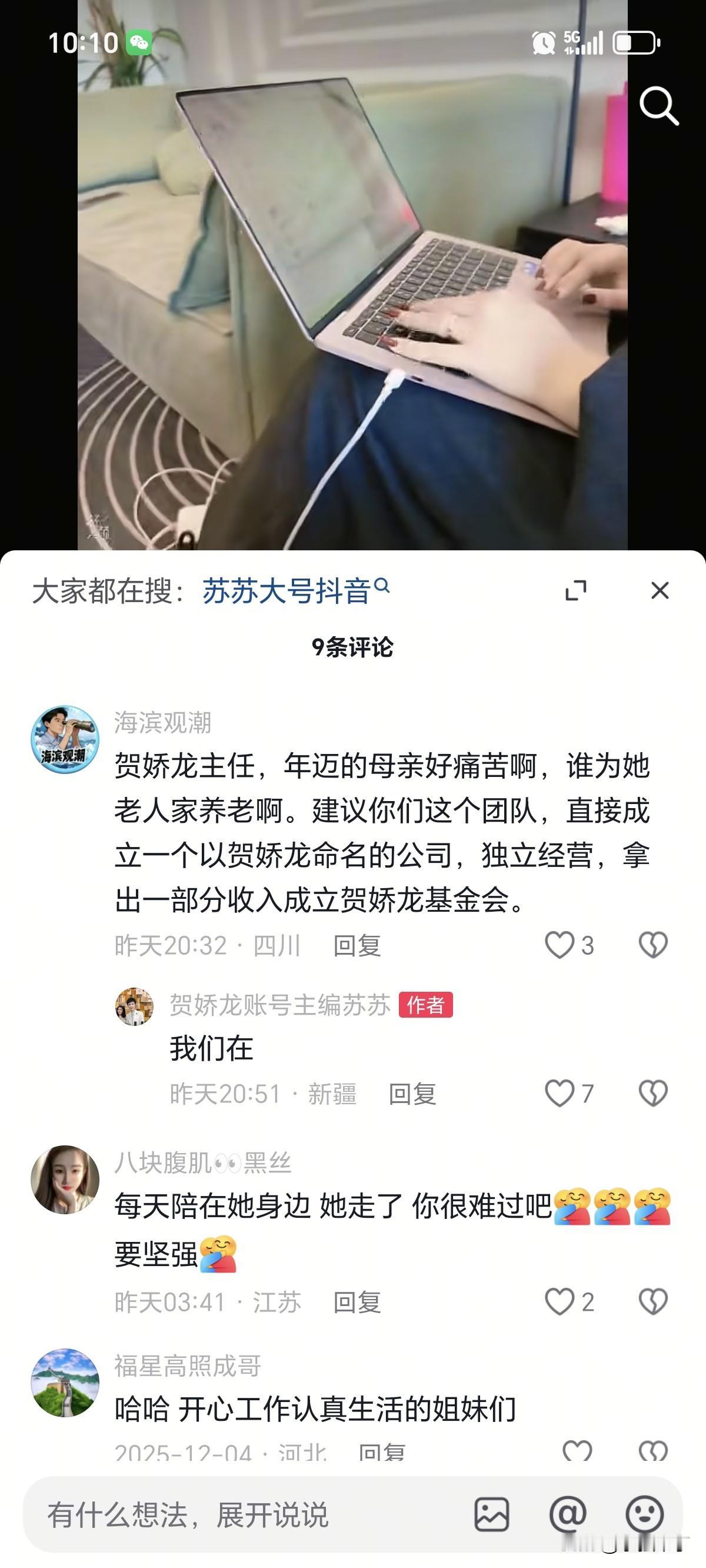 贺书记去世后,团队文案主编苏苏发文惦念,虽然是上下级关系,但私下相处很好,经常同穿“闺蜜装”合影,自爆:哭的已经没有眼泪了,只有麻木,抗拒接受现实。 确实,俗话说,千里马常有,而伯乐不常有,能找到欣赏自己的人,一起干事业,真是人生一大喜事。 不过,也站好了最后一班岗,替天堂的贺书记,回复成千上万粉丝的暖心留言,忙不过来就默默点赞。 有网友说:帮忙送上一朵花吧。 有网友说:选一张最美的照片当遗像。 值得一提的是,有网友建议,留下年迈的母亲该多痛苦呀,未来的养老问题怎么办呢?这个团队别解散,直接用贺娇龙命名公司,独立经营,拿出一部分资金成立基金会。 苏苏回复:我们都在。从侧面证明,接下来也在考虑这个事情,毕竟之前的成果,不能付之东流。 最后,苏苏也奉劝,各位粉丝,不要因为纪念贺书记盲目在橱窗下单,避免过度消费。