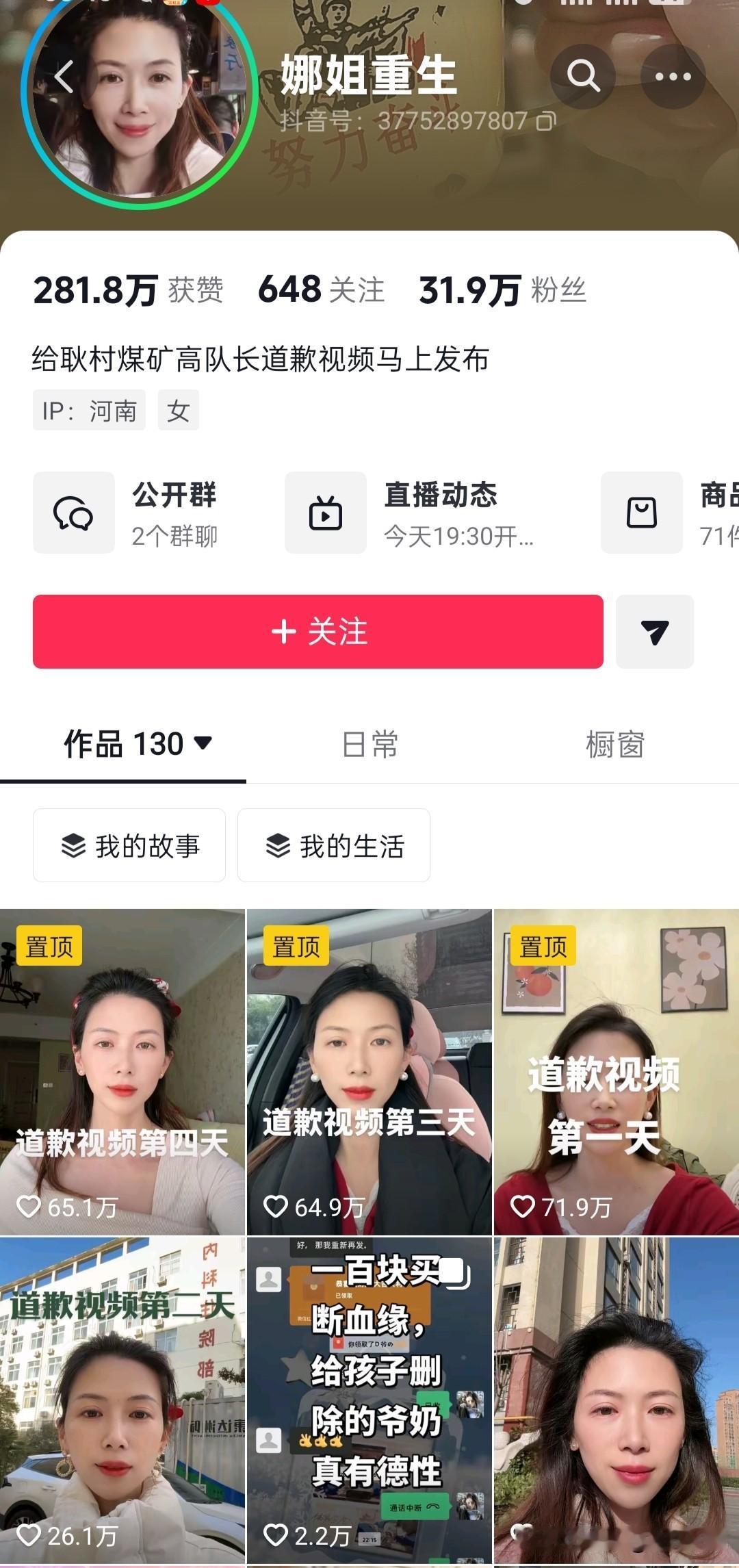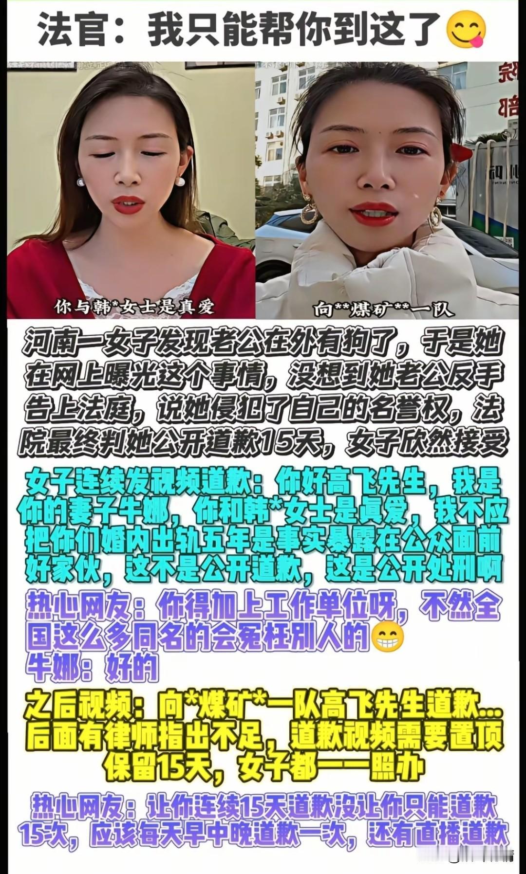 河南女子被判向出轨丈夫连续道歉15天,直接火上热搜,女子将道歉拍成了连续剧,网友直呼精彩! 生活在河南省义马市耿村矿的牛女士,本来有一个幸福的家庭,她和自己的老公高某育有一个女儿!在小县城两人的收入一个月也有一万五! 这样的家庭收入在当地也算是富裕家庭了,奈何饱暖思淫欲,她30多的老公居然出轨单位女同事,并且一出轨就是5年,直到她发现老公给别的女人买东西! 这个幸福的家庭就此破碎,生气的她在网上写小作文内涵她老公,还晒出了老公给单位女同事买丝袜化妆品的购物记录,甚至买了纪梵希2000多的羽绒服。 老公发现后就对她实施了家暴,将她的额头打破,身上打的都是淤青,就连脖子上也有抓痕!还设计摔碎了她的手机。 殴打她的老公并不解气,还把他告上了法庭,以侵犯名誉权获胜,还想要她赔偿2万元的精神损失,不过法院没有支持! 拿到法院判决了她决定网上发视频公开道歉,不过道歉内容确实让人很解气,他直接讲述了自己老公出轨5年,殴打她的事实! 一想到道歉第一天直接在网上火了,网友们纷纷表示让她说具体点,以免误伤他人! 听劝的她第二天道歉,直接点名了老公的工作单位和地址,还在老公工作单位外举着手机进行道歉! 从她的道歉视频中可以看出,她的老公是义马市耿村矿机电一队的高队长,出轨对象是他的技术员韩女士! 结果不出意料,她的这条道歉视频又火了,短短两天涨粉20万!这让她直接成为了一名小有名气的网红,甚至网友为了支持她,自掏腰包替她投抖加! 第三天的道歉视频直接让各大官方媒体报道,老公出轨5年,殴打妻子,还将妻子告上法庭,让妻子公开道歉15瞬间成为了网络关注新闻。 横村矿没想到会以这样的方式出名,她的老公高队长没想到她的妻子会这样道歉,小三技术员韩某也没有想到自己在当地成为名人! 从视频中可以看出,博主娜娜道歉真的很诚恳,她表示她的老公和小三是真爱,是她阻挡了两个人的发展,她的老公不愧是好领导,可以满足女同事的物质和生理需求,还会去对方家帮助对方生活,讽刺感拉满! 大家对于河南女子反向给出轨老公道歉走红这事怎么看?