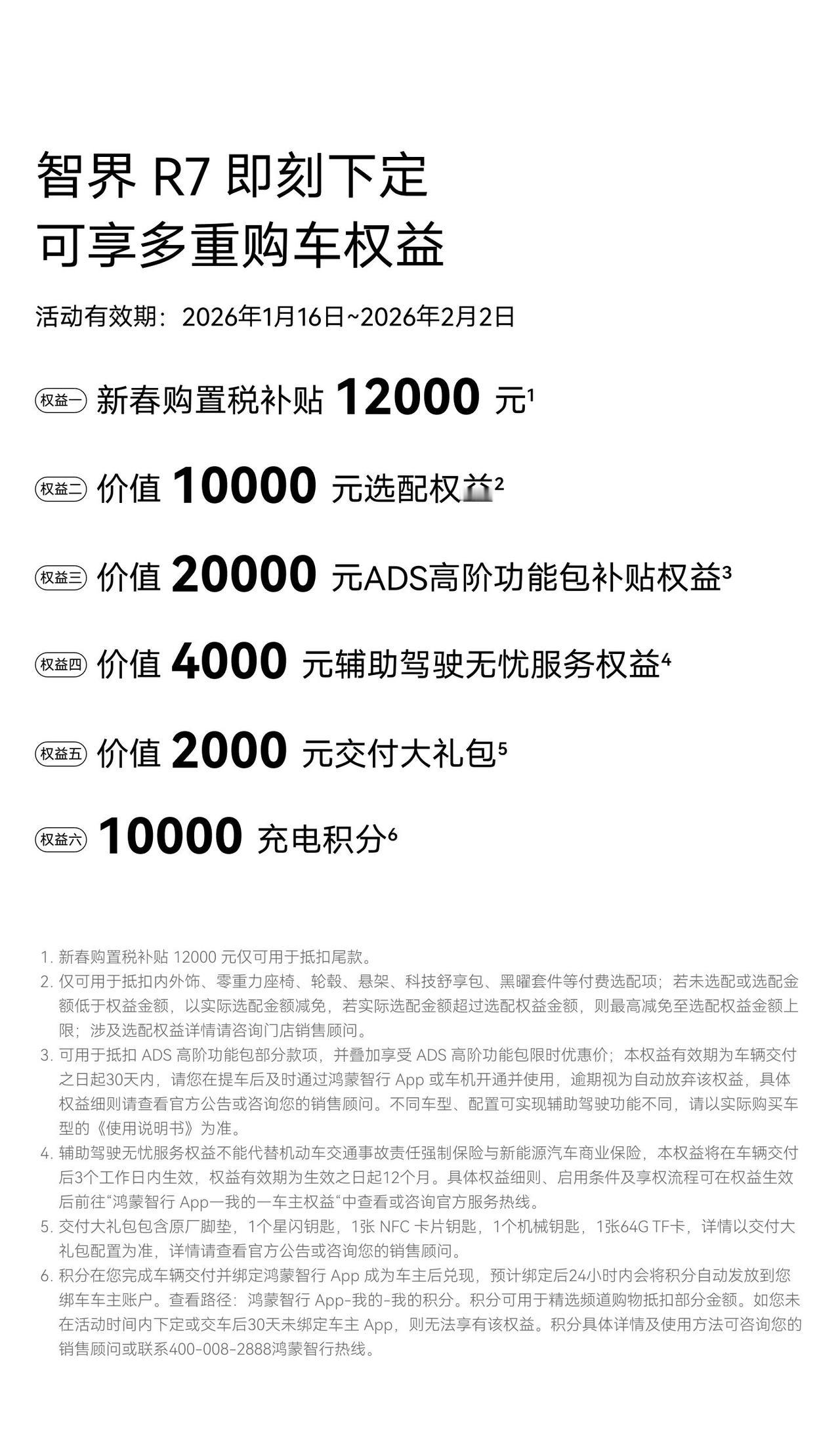 从销量增长到价值回馈,智界如何通过权益建立深层信任? 当智界连续三个月交付破万的成绩单摆在面前时,其推出的新春权益方案就格外值得分析,全系车型至高12000元购置税补贴,配合智界R7最高42000元、智界新S7最高59000元的购车权益,这套明确的数字方案背后有着深刻的市场逻辑。 这份权益最值得称道的是其建立的信任传递机制。明确的补贴金额不仅让用户容易计算实际利益,更体现了品牌的透明度与诚意。在销量稳步攀升的阶段,很多品牌往往会缩减优惠力度,而智界反而加大回馈,这种反向操作实际上是在将市场表现转化为用户信任。它传递了一个清晰信号,品牌的成长红利将与用户共享。