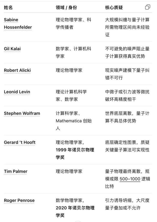 更重要的是,视频中所引用的质疑,并非来自边缘声音,而是出自一批在理论物理与计算基础领域具有一流水准的专家。其中不乏长期深度参与量子物理、计算理论与物理基础领域研究的顶尖学者,甚至包括两位诺贝尔奖获得者。这些观点是否成立,当然可以继续讨论,但将其简单视为“外行唱衰”或“个人情绪化判断”,显然并不符合事实。这里有一张表格,列出了视频中提到的相关学者姓名与其质疑要点,供读者参考。