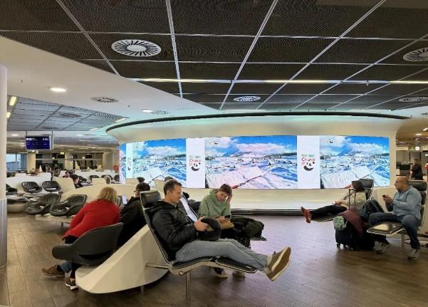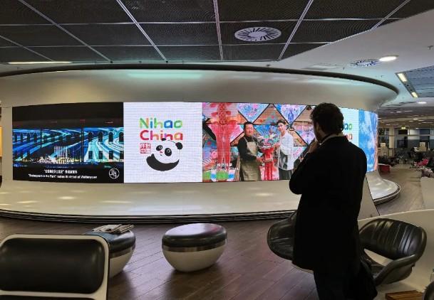在法兰克福机场1号航站楼B区2层非申根出发区域,一块面积超过30平方米的弧形大型广告屏全天循环播放“你好!中国”主题宣传片、中国冰雪旅游海外推广季相关视频,以及中国多个省市的旅游宣传视频。该大屏位于多条中德航线的核心候机区域,旅客停留时间长、人流密度高,是机场内极具传播价值的展示点位。