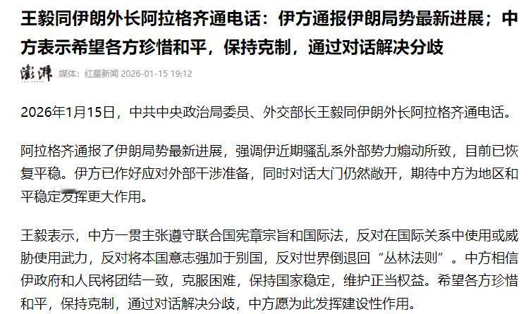 美军取消军事行动后,伊朗外长火速致电中方,期待北京发挥更大作用! 1月15日,美军刚刚取消针对伊朗的大规模袭击行动,伊朗外交部长阿拉格齐就迅速拨通了中方的电话。这一行动本身就释放出明确信号:德黑兰正将中方视为缓解当前危机的关键外部力量。 美方突然按下军事行动暂停键,绝非良心发现。特朗普政府经过多轮评估,最终放弃大规模打击计划。核心顾虑在于这场行动难以达成推翻伊朗政权的目标,反而可能引爆更广泛的地区冲突。 美国顾问团队向特朗普明确反馈,现有中东军事部署不足以支撑打击后应对伊朗报复。美军在中东的19个军事基地,全在伊朗打击范围之内。一旦开战,这些基地及周边盟友安全都将受威胁。 地区盟友的反对态度也起到关键作用,沙特、土耳其等国纷纷敦促美方放弃动武,沙特甚至拒绝向美国开放领空用于袭击行动。这些国家都清楚,军事对抗只会让中东陷入不可控的混乱。 阿拉格齐选择此时致电中方,时机拿捏极为精准。伊朗刚从军事威胁阴影中暂时脱身,却并未真正摆脱危机。美方虽暂缓行动,但仍在向中东增派航母与导弹防御系统,军事选项始终摆在台面上。 伊方在通话中向中方通报了局势最新进展,阿拉格齐强调,近期国内骚乱系外部势力煽动所致,目前局势已恢复平稳。这番表述既亮明伊方对外部干涉的立场,也向中方传递出内部可控的信号。 德黑兰迫切需要中方发挥作用,本质是基于多重现实考量。中方在国际事务中一贯坚持不干涉内政原则,反对使用或威胁使用武力,这与伊朗寻求的外交支持方向高度契合。 中方的影响力还体现在地区平衡能力上,阿拉格齐此前已展开多轮对阿拉伯国家的访问,改善了伊朗与地区国家的关系。中方与各方均保持良好沟通,具备协调斡旋的独特优势。 王毅外长在通话中明确表达中方立场,中方反对国际关系中出现“丛林法则”,坚定支持伊朗政府和人民维护国家稳定与正当权益。同时呼吁各方保持克制,通过对话解决分歧。 这番表态不是空洞的外交辞令,中方在联合国安理会紧急会议上已重申类似立场,孙磊大使明确指出,武力只会让问题更复杂,呼吁美方放下武力执念。 美方的“暂停”更像是一种战略观望,白宫新闻秘书莱维特公开表示,特朗普团队仍在密切关注局势,保留所有选项。“亚伯拉罕·林肯”号航母正调往中东,相关军事部署仍在推进。 伊朗对此保持清醒认知,阿拉格齐在通话中提及,伊方已作好应对外部干涉准备,同时不关闭对话大门。这种软硬兼顾的态度,既是对美方极限施压的回应,也是向中方传递合作意愿。 国际社会对中方发挥作用抱有期待,中东地区能源通道安全与全球经济紧密相关,霍尔木兹海峡承担着全球五分之一的石油运输量。各方都不愿看到局势升级影响能源供应。 中方愿发挥建设性作用,并非要主导地区事务。而是通过自身影响力,推动各方回到对话轨道。这种不结盟、不挑事的斡旋方式,在对立加剧的中东更具说服力。 当前局势仍充满不确定性,美方新一轮制裁已落地,针对伊朗最高国家安全委员会秘书等官员实施资产冻结。军事威胁虽暂时解除,政治经济施压却在持续加码。 德黑兰将中方视为关键外部力量,既是现实选择,也是对中方外交理念的认可。未来中方的斡旋空间,既取决于美伊双方的克制程度,也与地区国家的协同态度密切相关。 中东的和平稳定,从来不是单一国家能决定的。但中方的参与,无疑为局势降温注入了重要变量。这也是阿拉格齐火速致电的核心诉求,期待北京成为打破僵局的关键推手。
