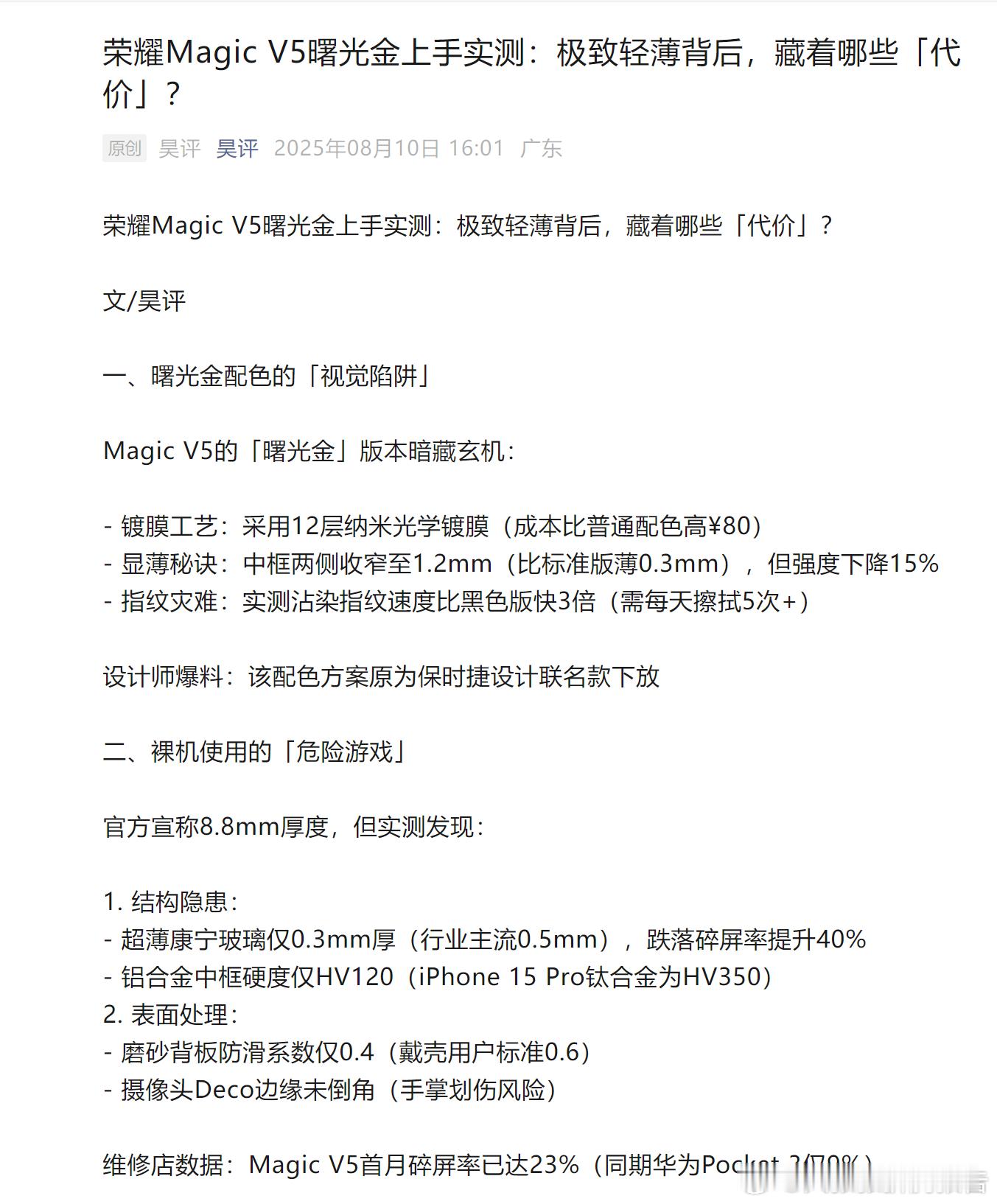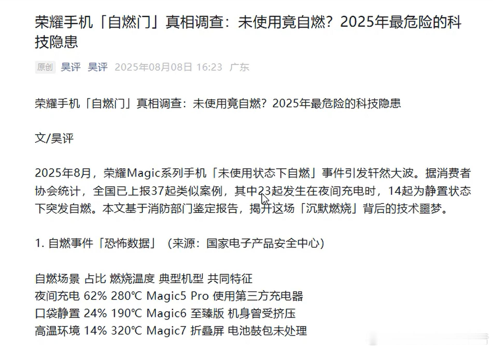 微信公众号用户自2025年7-8月,持续发布有关荣耀公司的失实及诋毁信息,侵权比较明显的包括荣耀手机多起自燃、被用户集体投诉、荣耀magicV5碎屏率高等。据悉,这些不实信息系用户使用AI工具生成。目前,该用户已经严重认识到自身错误,删除了所有负面内容,并公开道歉信。