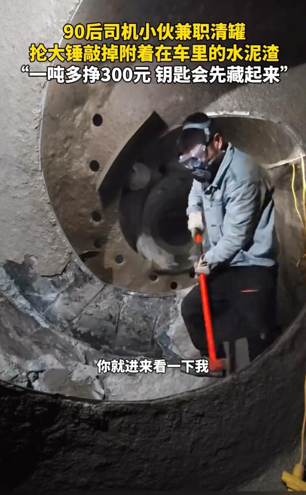 湖南90后司机小杨,白天开着搅拌车跑运输,累得腰都直不起来,晚上却还要钻进罐车里加班。抡着十几斤的大锤,敲罐壁上凝固的水泥渣,清一吨能多挣300块。 这活看着能赚钱,实则全是风险。罐子里空间窄得转不开身,水泥粉尘呛得人喉咙疼,挥一小时大锤手臂就酸得抬不起来,汗水混着灰在身上结成泥壳。 更危险的是,万一有人误启动车辆,罐里的人根本跑不掉。所以小杨有两个保命习惯:开工前先把车钥匙藏到没人找得到的地方,每隔一小时还得给工友发消息报平安,“超过时间没信儿,就让他们赶紧来救我”。 他不是不想歇,是家里实在离不开这份钱。开搅拌车每月挣8000块,扣掉房贷、即将出生孩子的奶粉钱,根本剩不下多少。现在每晚干4小时,能清1.5吨水泥渣,多挣450块,“能给老婆多买些营养品,再苦也值”。 和小杨一样的年轻司机不少,他们大多是家里的顶梁柱,有人还特意学了清罐技术、考了资格证。对他们来说,这一锤一锤敲的不是水泥,是给家人的踏实生活,藏起来的钥匙,藏着的是对安全的小心,更是对日子的盼头。
