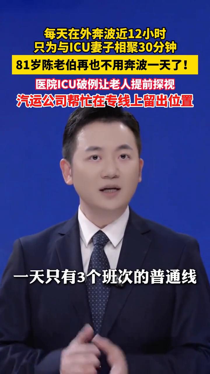 每天在外奔波近12小时,只为与ICU妻子相聚30分钟。81岁陈老伯再也不用奔波一天了!医院ICU破例让老人提前探视,汽运公司帮忙在专线上留出位置。 舟山金塘市民陈老伯,奔波在外近12小时,只为与妻子相聚30分钟。好在有各路好心人的帮助,81岁陈老伯再也不用奔波一天了!家住舟山的81岁陈老伯每天坐公交前往宁波探望住在ICU的老伴。金塘到李惠利医院没有专线,但是要36元。为了节省路费给老伴看病,陈老伯选择搭乘一天只有3个班次的普通线。 为此他每天清晨4点半就起床,做好饭菜后6点准时从家里出发乘坐大巴。探视结束后又要在医院走廊等到下午乘坐3点的大巴回家。医院ICU探视时间原为上午10点半到11点,了解情况后破例让老人提前探视,好搭乘10点40分的车回家。 事情一经报道后,舟山市汽车运输有限公司特意为陈老伯预留了金塘到宁波李惠利医院专线上离门口最近的一个位置,并免除了他所有相关班线的车费,车程也从以前的5个小时缩短到1个半小时。icu家属 icu照顾
