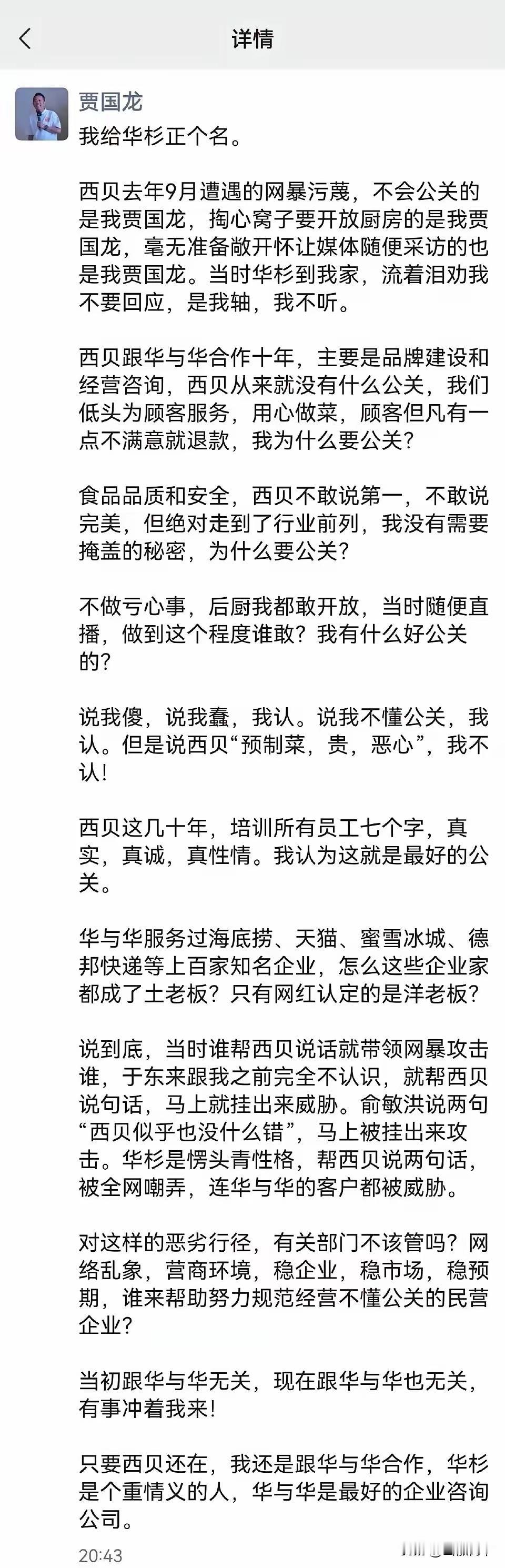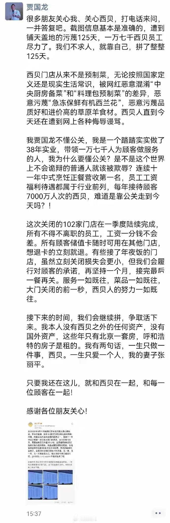 一个馒头卖20多,一个花卷卖30多,一碗米饭也不卖多少钱,还都严重夸大宣传,说米饭是从日本请来的米饭仙子蒸的,馒头用的是山泉水和的面,给孩子吃的西兰花比孩子都大,他吃的是他大哥吧!大棒骨热热就上桌,价格要的是高档价,一盘牛肉总共没几块,居然说来自三个国家的牛 …… 是这么回事吗?有这么回事吗? 西贝这么干了好几年啊! 我真是弄不清,贾国龙有什么可委屈的?但凡看看上面这些做法,静下心仔细想想,他该做的难道不应该是忏悔吗?西贝这次要关100家店,他不冤!大浪淘沙,沉者为金!这么飘飘忽忽的做生意,宣传不负责任,信口开河,张口就来,出事之后,不悔改,不思量,不颤抖,反而说自己遭到污蔑,还125天,西贝啊西贝,贾国龙啊贾国龙,你长长心吧!