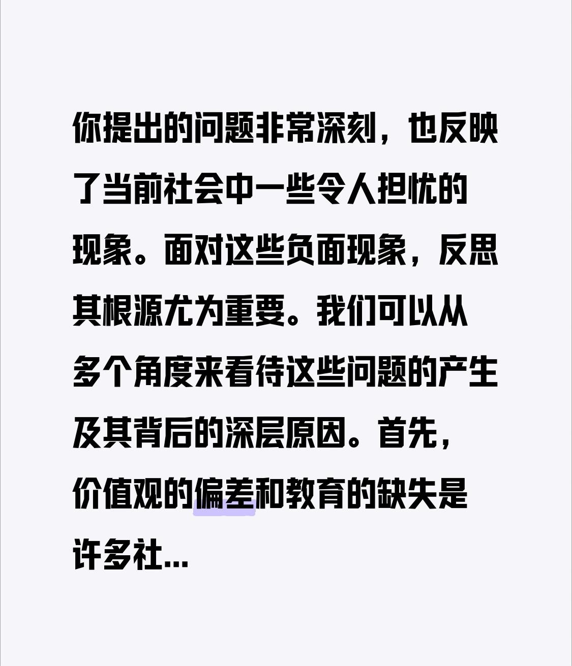 你提出的问题非常深刻,也反映了当前社会中一些令人担忧的现象。面对这些负面现象,反思其根源尤为重要。我们可以从多个角度来看待这些问题的产生及其背后的深层原因。 首先,价值观的偏差和教育的缺失是许多社会问题的根源。部分人缺乏正确的价值引导,三观(世界观、人生观、价值观)出现偏差,导致诚信缺失、道德沦丧。例如,老赖、碰瓷、投毒、拐卖儿童等行为,反映出一些人在利益面前失去了底线,缺乏基本的道德底蕴。 其次,社会制度和环境的影响也不可忽视。贪污腐败、恶性案件的发生,往往与制度漏洞、监管不到位有关。部分人利用制度的空隙谋取私利,形成了“潜规则”和“灰色地带”。同时,部分人面对生活压力、竞争激烈,选择了“躺平”或投机取巧的方式,反映出社会压力与个人心理的扭曲。 再次,家庭教育和社会环境的作用至关重要。孝顺父母、尊重长辈的传统美德逐渐被淡化,一些家庭缺乏正确的价值观传递,导致青少年价值观扭曲,甚至走上违法犯罪的道路。社会风气的负面影响也会助长不良行为。 面对这些问题,我们每个人都应“沉下心来反问一下”:我们自己在日常生活中是否坚守诚信?是否用正确的价值观引导子女?社会制度是否公平公正?教育是否注重品德培养?只有从自身做起,从家庭、学校、社会多个层面共同努力,才能逐步改善这些问题。 此外,政府和社会也应加强法治建设、完善制度监管、弘扬正能量。倡导诚信、尊重法律、关爱弱势群体,营造一个正气充盈的社会环境。每个人都应成为“正能量”的传播者,用行动践行善良与诚信,逐步扭转社会风气。 总结而言,社会问题的出现,既有制度和环境的因素,也有人性的缺陷。我们需要以反思的态度,正视问题根源,从自身做起,积极参与社会的正向引导,共同营造一个更加健康、和谐的社会。只有这样,才能让“人品”成为社会的主旋律,让我们的未来更加光明。从根本上看问题 对社会问题剖析
