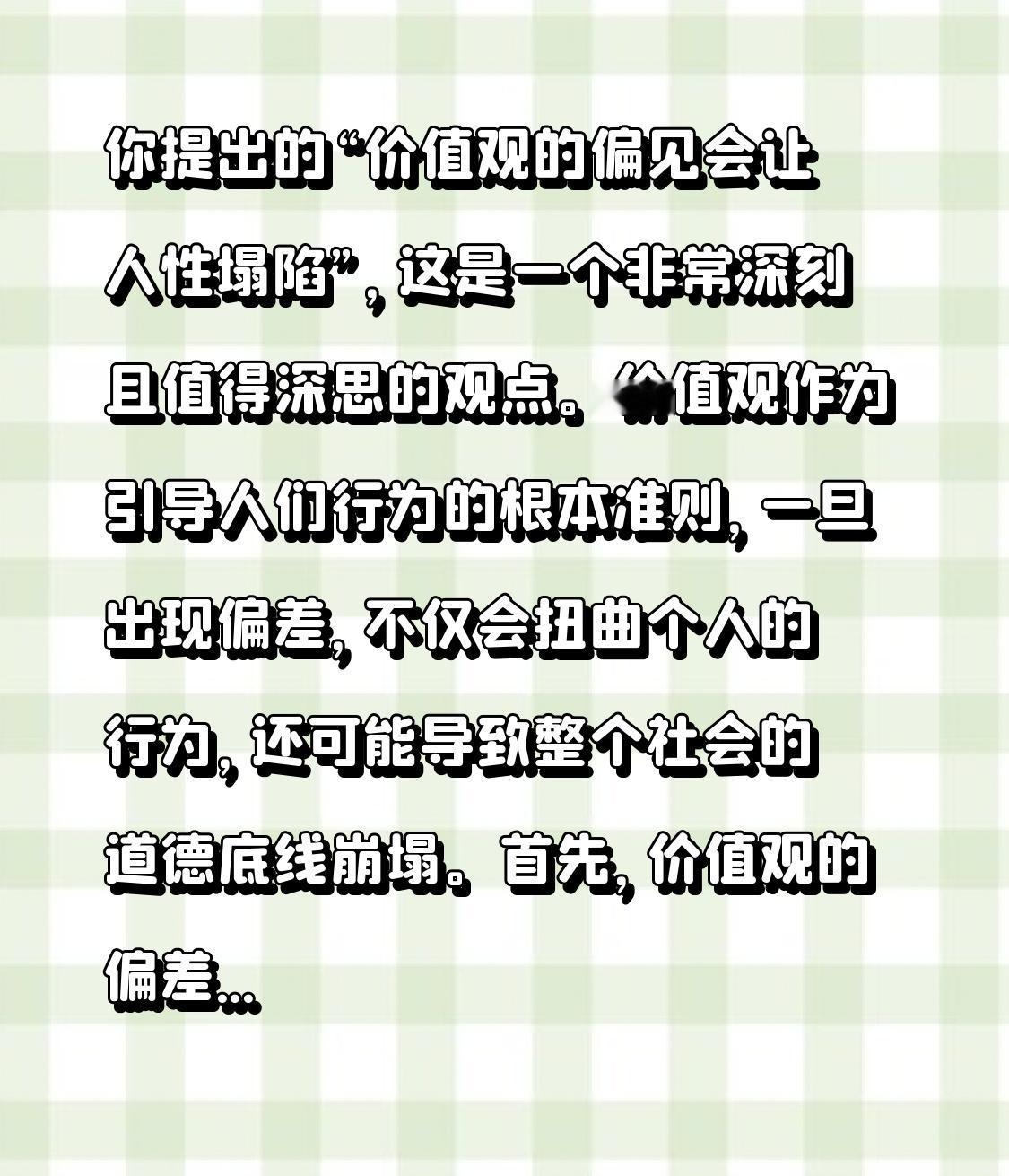 你提出的“价值观的偏见会让人性塌陷”,这是一个非常深刻且值得深思的观点。价值观作为引导人们行为的根本准则,一旦出现偏差,不仅会扭曲个人的行为,还可能导致整个社会的道德底线崩塌。 首先,价值观的偏差源于多方面因素。家庭教育的缺失、社会环境的负面影响、媒体的误导、甚至教育体系中的不足,都可能让个体形成扭曲的价值观。例如,过度追求金钱、名利,忽视了诚信和善良的重要性,容易让人变得功利、自私,逐渐失去对道德的坚守。 其次,价值观的偏见会直接影响人的人性。人性本善,但如果长时间被扭曲的价值观所侵蚀,就会逐渐丧失善良、同情、责任感等核心品质。比如,为了利益不择手段、背后算计、甚至违法犯罪,这些行为都源于价值观的扭曲。长此以往,社会中的善良与正义会被侵蚀殆尽,人性也会变得扭曲、塌陷。 再次,价值观偏差还会引发一系列恶性社会现象。老赖、碰瓷、贪腐、恶性案件、拐卖儿童等行为,背后都隐藏着价值观的失衡。人们如果只追求短期利益,忽视道德责任,就会走向“人性塌陷”的边缘。 面对这一现象,我们应当反思:如何修正偏差的价值观?首先,教育起到关键作用。家庭、学校和社会应共同努力,弘扬正能量,强化道德教育,让正确的价值观根植于每个人心中。其次,制度建设也不可或缺。通过法律和制度的约束,维护公平正义,遏制不良风气的蔓延。 更重要的是,每个人都应自觉反省:自己的价值观是否健康?是否以善良、诚信为核心?只有当我们每个人都坚守正确的价值观,才能共同筑起一道坚不可摧的道德防线,避免人性走向塌陷的深渊。 总结而言,价值观的偏差确实具有极大的破坏力,它不仅影响个人的行为,还关系到社会的整体道德水平。我们要从自己做起,修正偏见,弘扬善良与正义,让人性之光照亮社会的每一个角落。只有如此,才能避免“人性塌陷”,让社会变得更加美好、更加有希望。 价值观人性 价值观