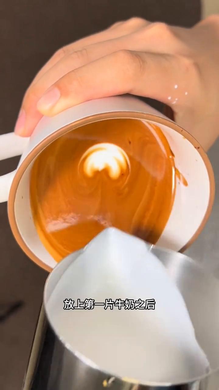 ·首先贴着杯边缓慢的向浓缩咖啡中倒入打发出奶泡的牛奶,等到咖啡液面升高之后再搅拌,一圈、两圈、三圈之后停顿一下。 ·接下来瞄准咖啡表面的中心点,放上第一片牛奶之后,接下来的第二、第三片牛奶轻轻的往前推,把之前的纹路撑开。 ·第二层结构拉开点距离,放上一片牛奶之后再往前推第三层结构,重复之前的操作。 ·最后再放上两颗小爱心,抬高拉花缸的高度,一条直线收尾。 这样一杯推出来的拿铁拉花图案就制作完成了。