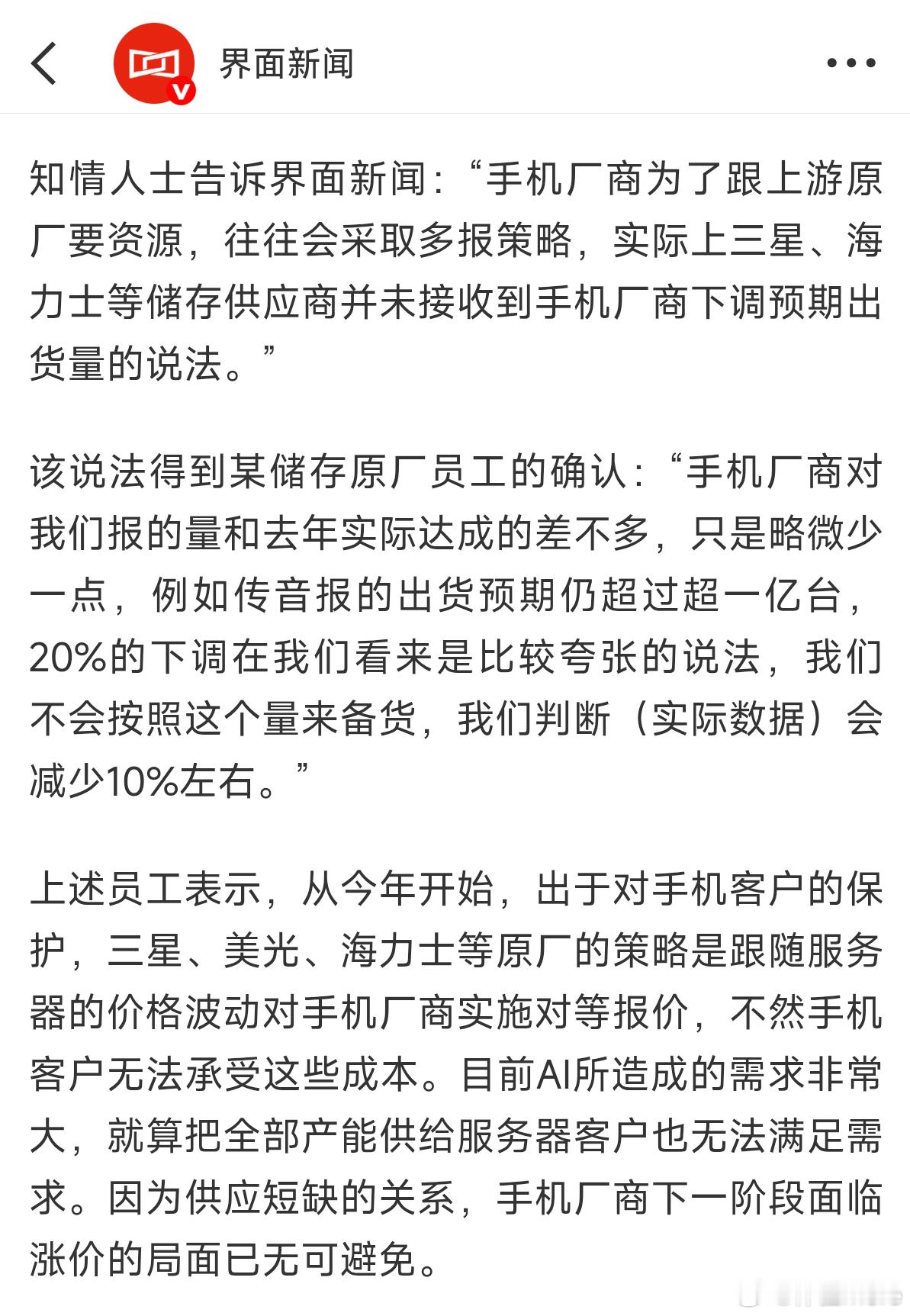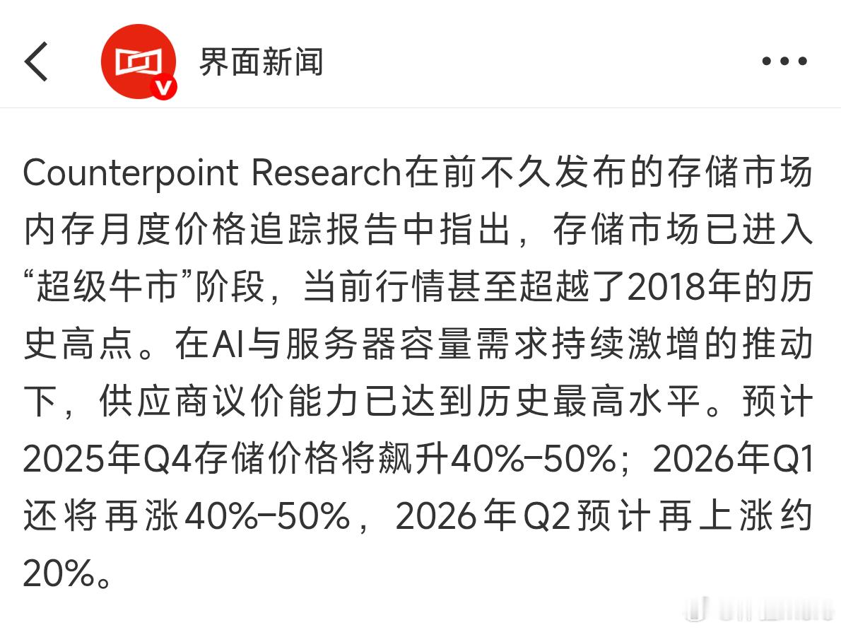 多家手机厂商下调全年出货预期根据界面新闻的说法:受上游供应链存储涨价影响,多家手机厂商近日下调全年整机订单数量,小米、OPPO下调超20%,vivo下调近15%,传音下调至7000万台以下,各家下调机型主要都侧重在中低端和海外产品。苹果、三星等头部厂商并未受到存储价格上涨的直接影响,华为、联想、荣耀等厂商则在本轮存储涨价中尝试谋求更多份额。某储存原厂员工:20%的下调在我们看来是比较夸张的说法,我们不会按照这个量来备货,我们判断(实际数据)会减少10%左右。预计2025年Q4存储价格将飙升40%-50%;2026年Q1还将再涨40%-50%,2026年Q2预计再上涨约20%。(也就是26年Q2存储价格是25年Q3的两倍多)