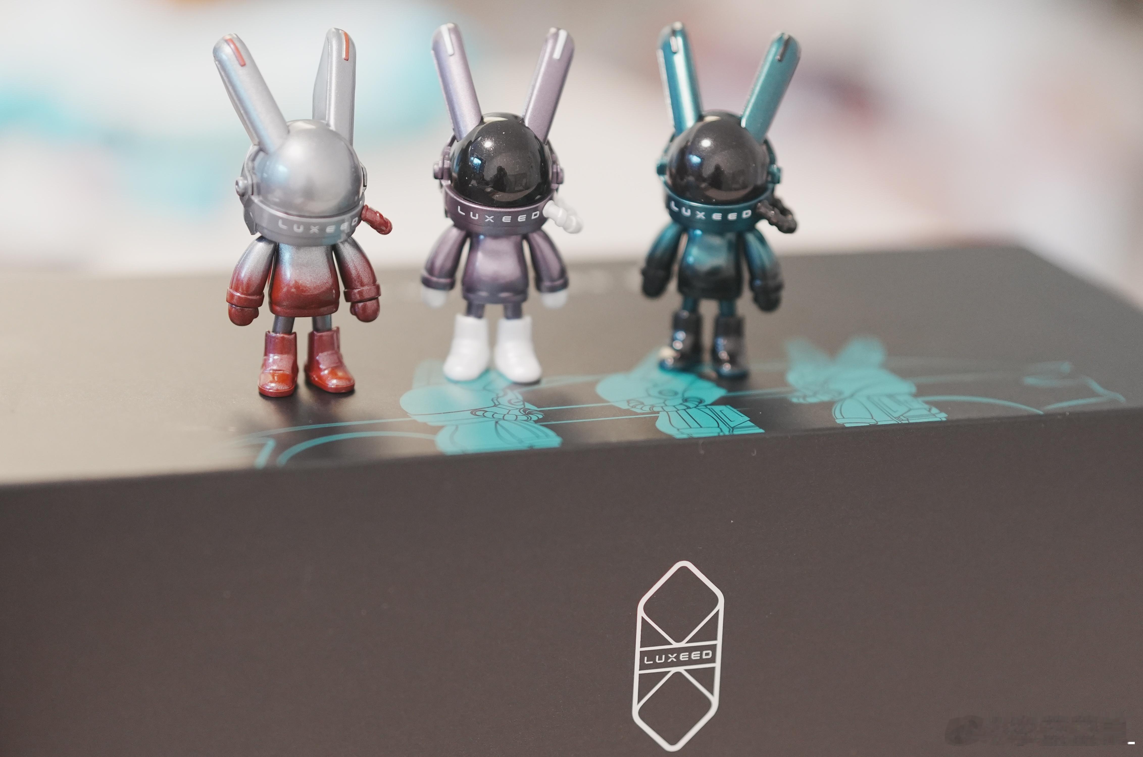 收到智界寄来的礼物。三个智界联名ROBBi定制的三款车漆颜色的手办。还有一个小帽