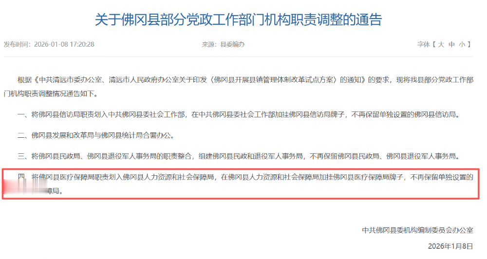 2026年1月8日,广东清远佛冈县发布《关于佛冈县部分党政工作部门机构职责调整的通告》,明确将佛冈县医疗保障局职责划入佛冈县人力资源和社会保障局,在佛冈县人力资源和社会保障局加挂佛冈县医疗保障局牌子,不再保留单独设置的佛冈县医疗保障局。