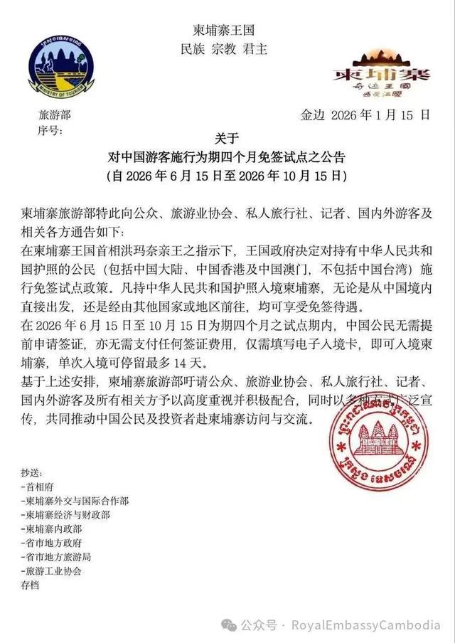 1月15日,柬埔寨王国政府旅游部正式发布《关于对中国游客施行为期四个月免签试点的公告》。