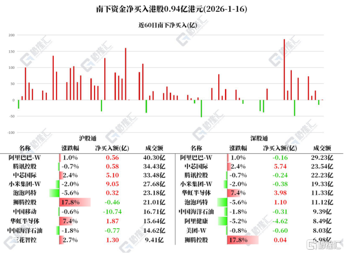 其中:净买入中芯国际10.84亿、小米集团-W8.67亿、华虹半导体5.85亿、泡泡玛特1.41亿、三花智控1.29亿;