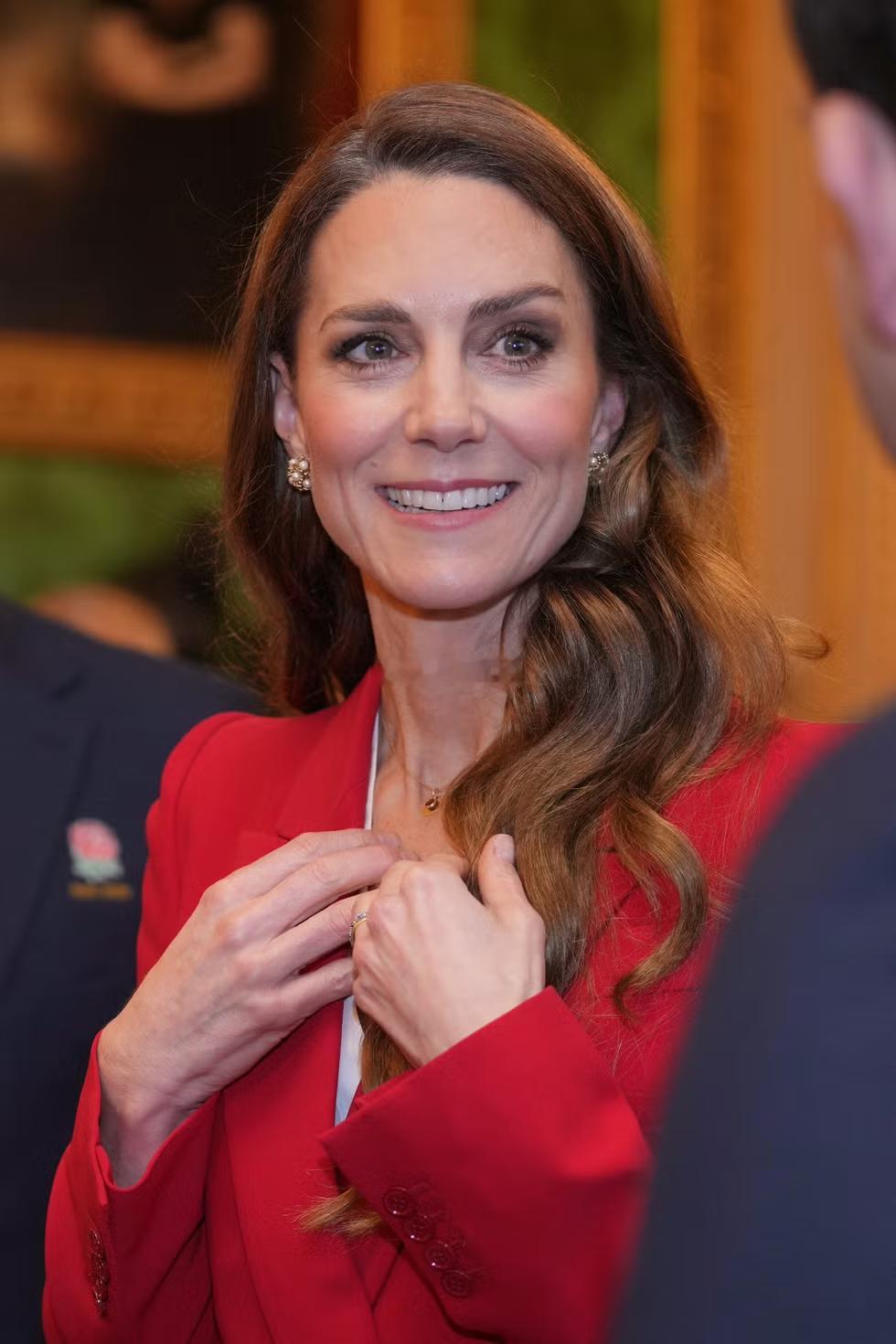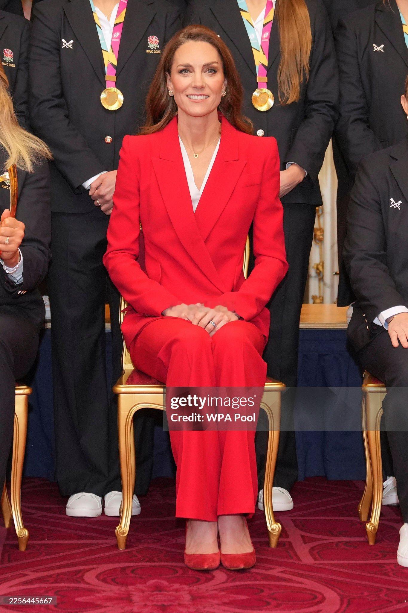 凯特在温莎城堡接见英格兰女子橄榄球队👇她穿了一身红色的Alexander Mc