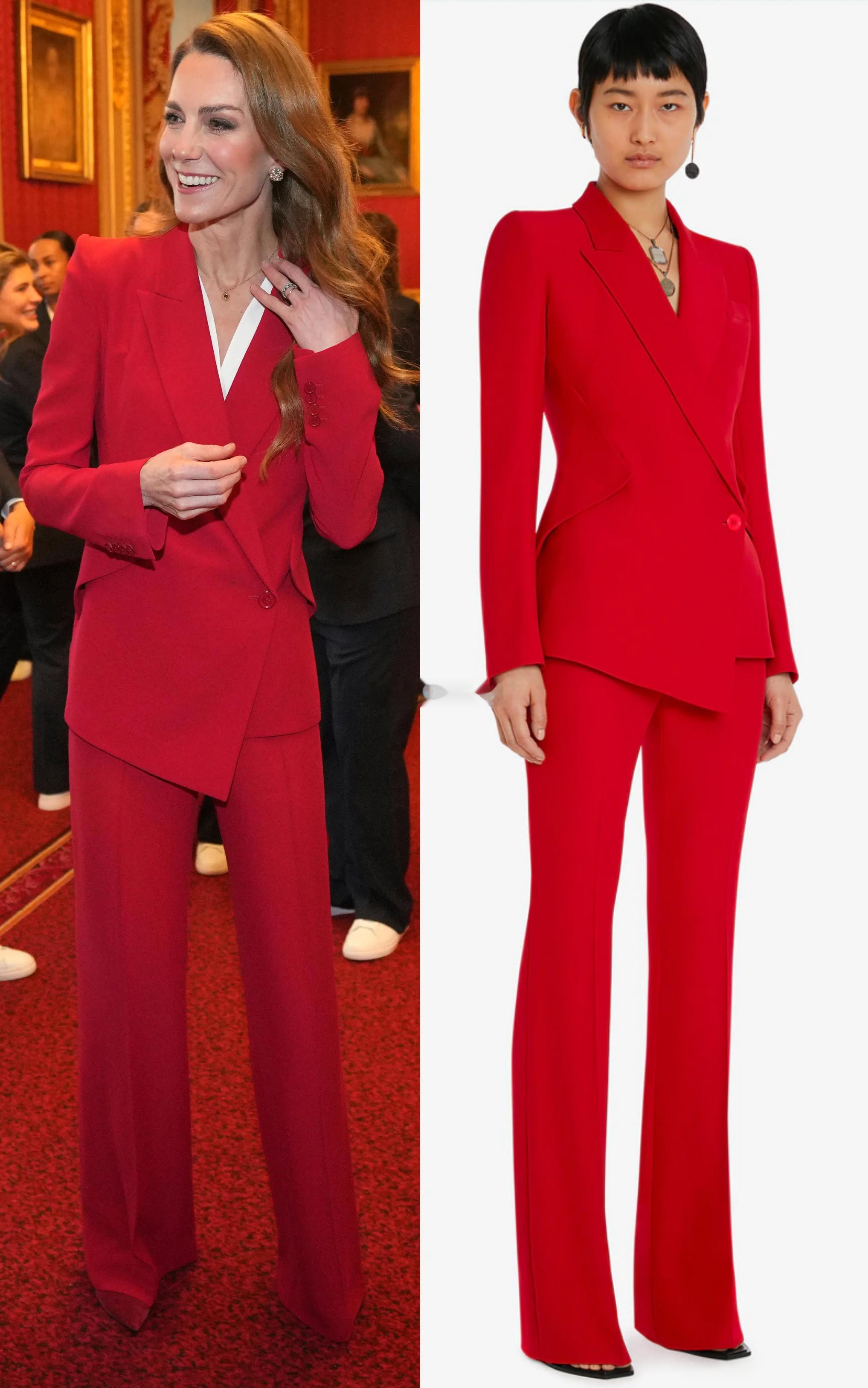 凯特在温莎城堡接见英格兰女子橄榄球队👇她穿了一身红色的Alexander McQueen不对称西装套装,搭配了一双Gianvito Rossi的天鹅绒红色高跟鞋👠