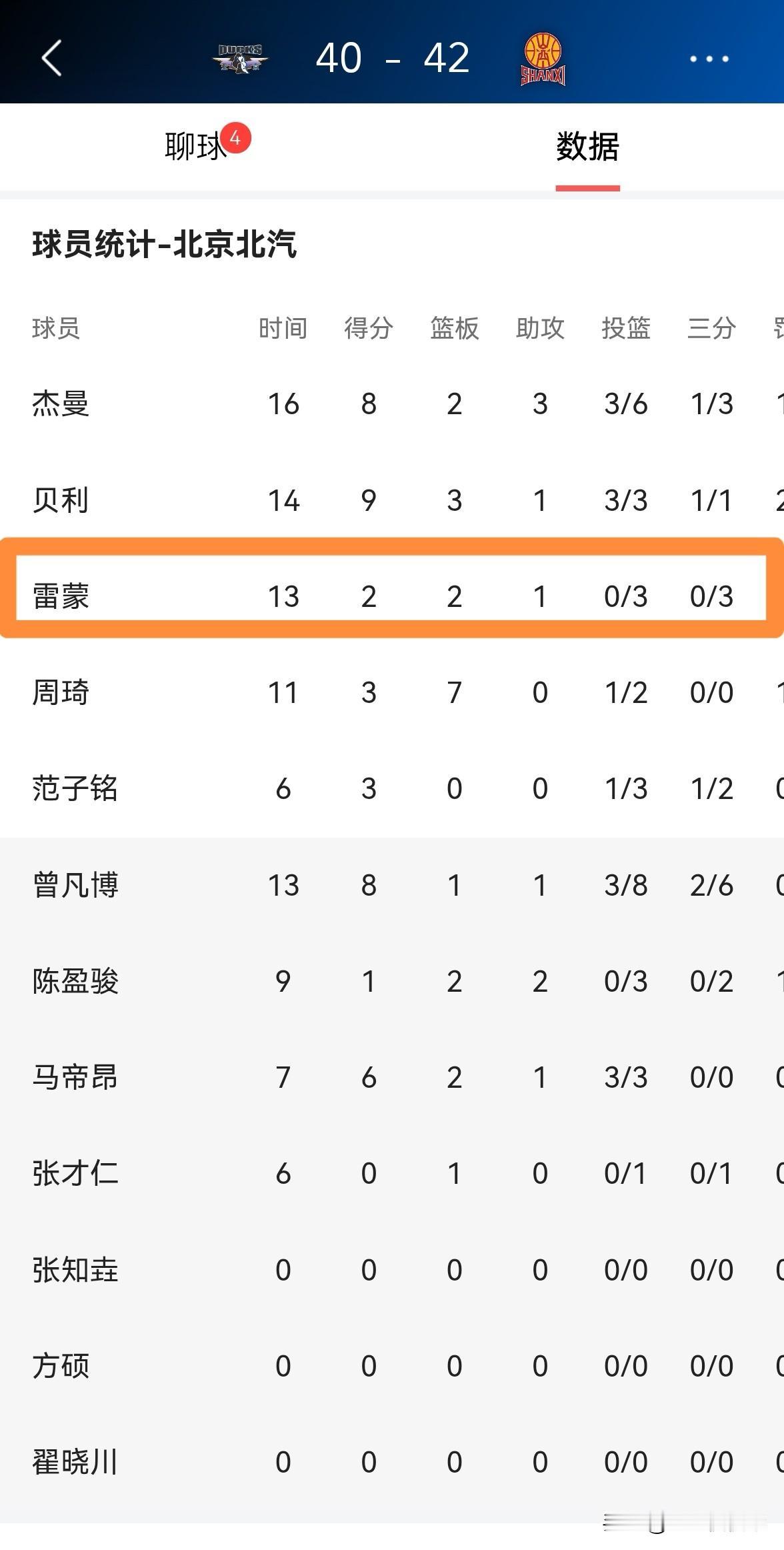北京北汽大将雷蒙真是太失常了!在今天北京北汽主场迎战山西汾酒的焦点战中,目前双方半场战罢,北京北汽以40:42落后于对手。在前两节比赛中,雷蒙在三分线外的表现非常失常,他在首发出战的13分钟里,三分球3中0,仅仅依靠罚球得到2分。 老实说,作为北京北汽在外线的主要火力点之一,如果雷蒙无法在下半场比赛中找回自己的投篮手感,那么北京北汽必败无疑。