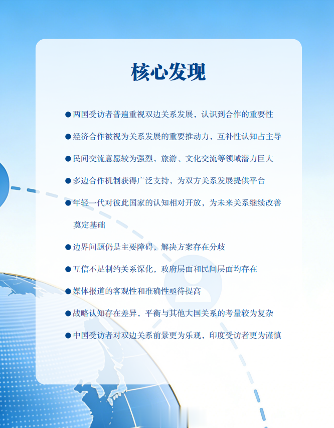 该民调是在中印关系逐步回暖、两国恢复多层级对话与合作的背景下开展的。两国权威机构联合开展此次民调,旨在通过科学、客观的民意测量,探究两国公众在关系预期、合作意愿、障碍因素等维度的认知,重点评估媒体在塑造舆论、增进理解方面所承担的责任与发挥的作用,并通过对比分析,展示当前中印关系的复杂现状和未来发展趋势。