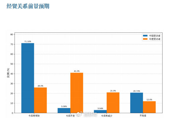 此外,报告指出,中印两国在民间交流重要性认知上高度一致,双方都高度重视民间交流,都认为青年交流最重要,都有强烈的人员往来意愿,都认为签证困难是主要障碍。两国受访者均对中印关系长期向好前景表现出更为明确的预期。