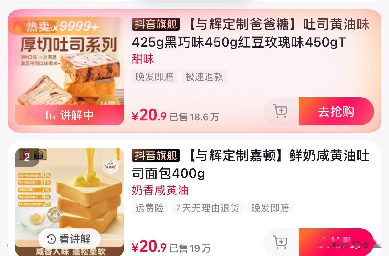 第一次见主播请求消费者退单的 董宇辉央求“要不你退一单吧”[笑哭] 他妈妈也在直播间里抢 抢不到他就会挨骂[捂脸] 直播间里正在上演抢吐司大战 实话实说, 今天买不到真不能怪董宇辉了 上架了60万单定制吐司 60万单啊,这不能是饥饿营销了吧 有新款跟嘉顿合作的咸口味 也有跟爸爸糖合作的老款 而且还限购了,每人两单 不过直播间里有70万人在线 抢不到也在情理之中 谁让消费者这么喜欢呢 董宇辉也说了 后续会每天上架的[耶] 大家别着急 一定会吃到的[笑哭]