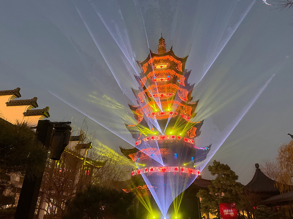 2026年1月16日晚,上海市松江区泗泾古镇安方塔亮灯。澎湃新闻记者邹娟摄