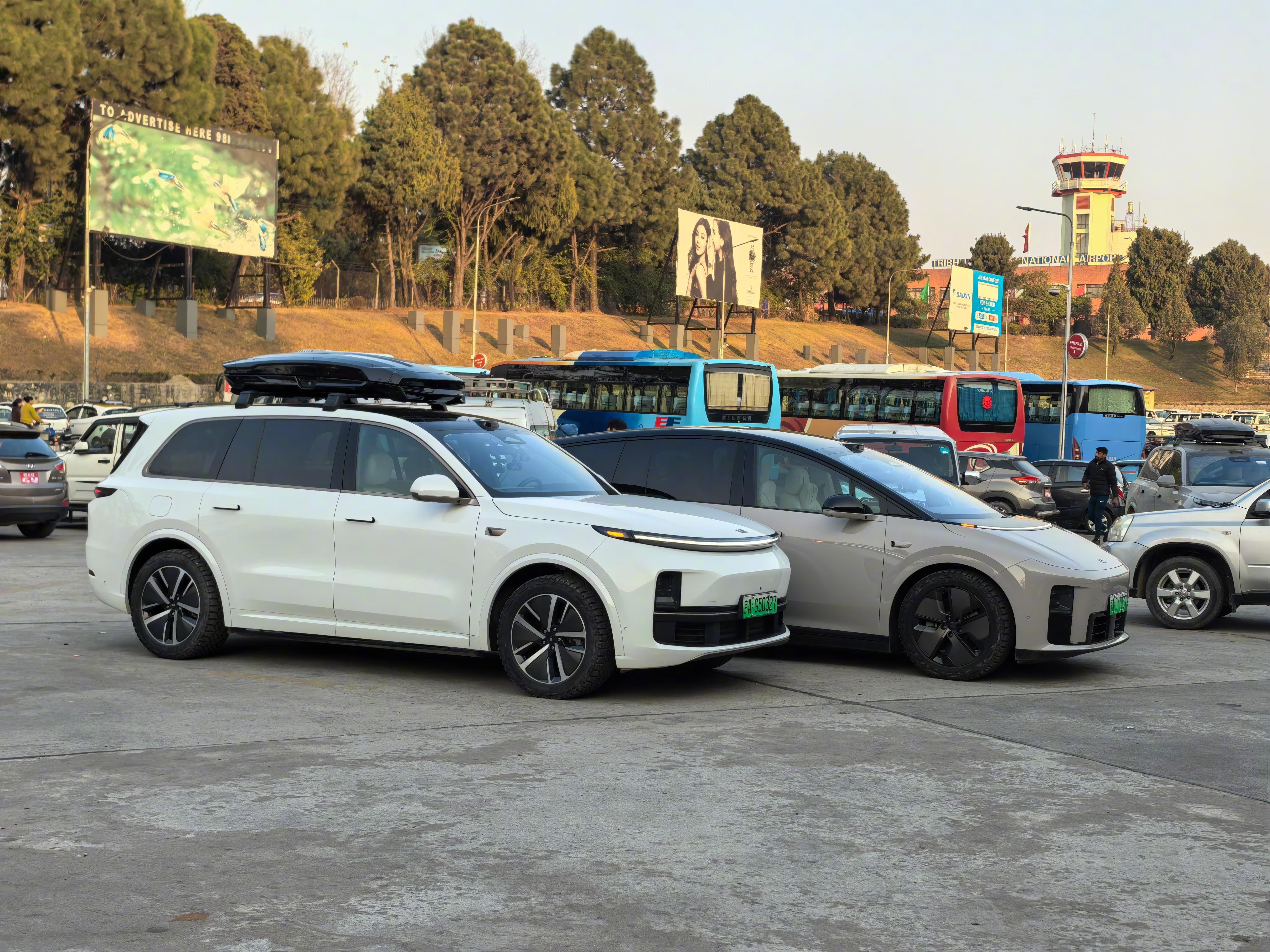 带傻哥们勇闯尼泊尔 临近加德满都最后1小时飞机,始终伴随着珠峰在飞,真美啊。这国家,哪怕首都也都是一堆矮楼。下飞机就是我们团队运过来的理想i8和L9,装了顶箱和AT胎,这几天就开他俩勇闯尼泊尔了。