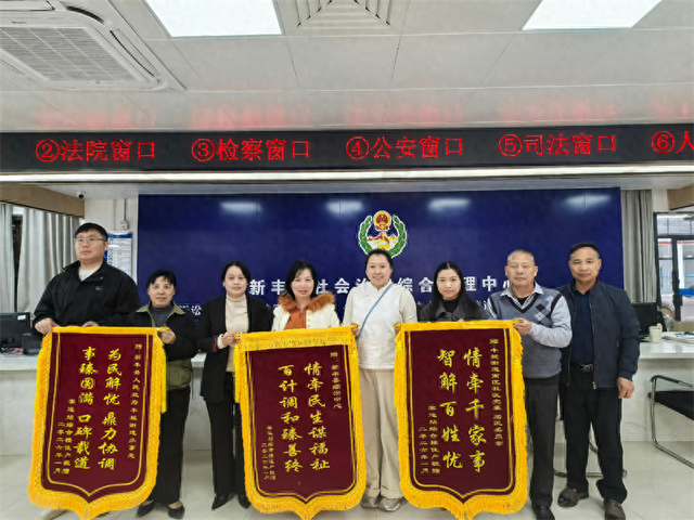 近日,韶关市新丰县客运站家属楼小区的胡女士等3名居民代表,手持一面印有“情牵民生谋福祉、百计调和臻善终”的鲜红锦旗,专程来到韶关市新丰县综治中心。