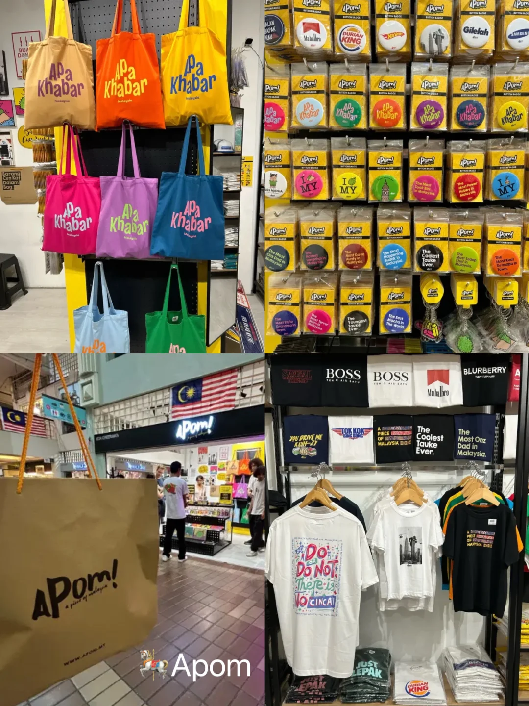 🎠Apom:本土品牌,宝藏伴手礼小店,在这里可以找到各种T恤、贴纸、帆布袋子、帽子🎩、杯子等文创品,设计上融入了马来西亚的文化和美食元素,是很有本土特色的纪念品店,旅行结束前可以过来逛逛,能淘到不少好东西