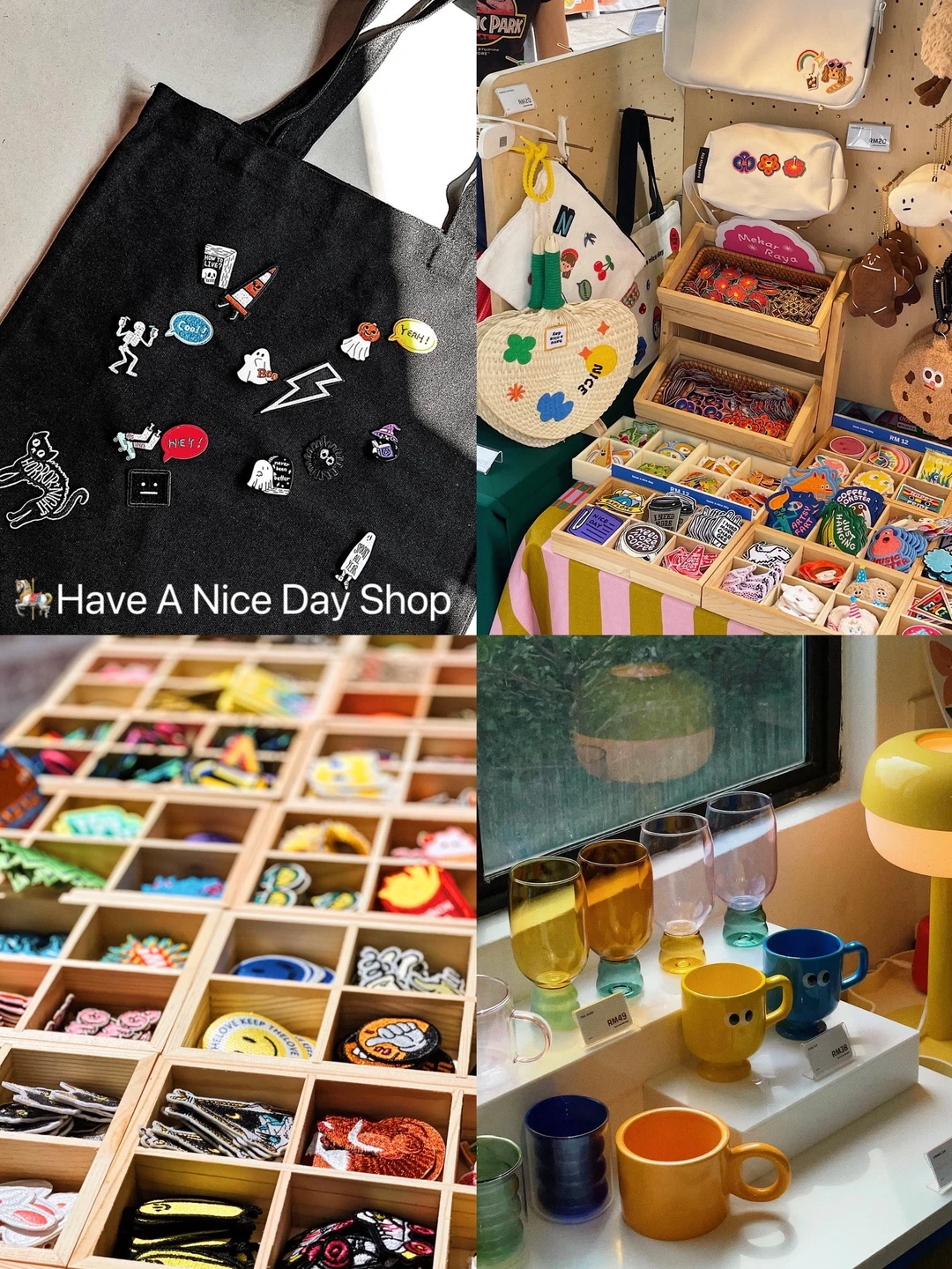 🎠Have A Nice Day Shop:这家店里有各种文具✏️、小包包、本子、挂绳、水杯、贴纸都是颜色很鲜艳很漂亮的小物件,不知不觉就会淘一大堆。这一家店除了可以买买买,还可以自己DIY,纯色的帆布包、吊饰搭配好看的刺绣图案