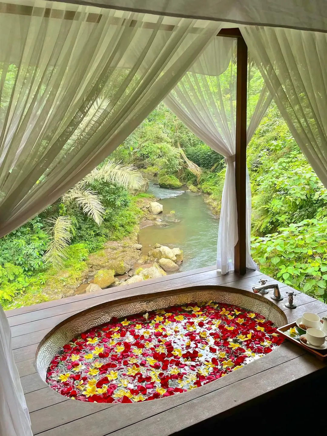 这家水疗中心坐落在乌布茂密的丛林中,毗邻宁静的佩塔努河,可以在浪漫的鲜花浴中放松身心,浴中装饰着多种色彩鲜艳的鸡蛋花,同时欣赏周围雨林山谷和下方流淌的河流的壮丽景色