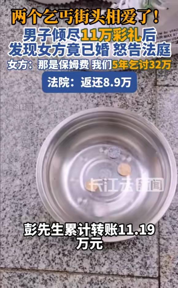 “离了个大谱!”青海西宁,一对男女在街头乞讨时相恋,同居5年后,男子想给女子一个名份,转账11万元当彩礼后,不料,发现女子竟是已婚,一气之下,将女子告上法庭! 据媒体1月16日报道,5年前,贵州的彭先生在西宁街头乞讨时,与来自宁夏同为乞讨人员的张女士偶遇认识。此时,彭先生已离异,张女士也称自己与前夫离婚,很快双方建立了恋爱关系,以夫妻名义同居。 2024年7月,彭先生决定要和女子相守一生,于是就提出了结婚,成为名副其实的夫妻。 谁知,张女士却提出了要20万元当做彩礼。 彭先生倾尽积蓄,先后给张女士转账11.19万元之后,意外发现其并没有离婚。 做人做事,不管你是乞讨者还是大老板,做人基本的底线就是诚实。既然已经结婚,就别装单身去谈婚论嫁。 彭先生越想越气,觉得张女士骗了他,就一纸诉状将其告上了法庭,要求返还彩礼钱。 经过法庭审理,张女士返回彭先生支付的彩礼钱80%,也就是8.9万余元。 而对于这一判决,张女士并不服,5年间二人共同乞讨共32万元,她认为这笔钱不算是彩礼,而是“共同乞讨所得及保姆费。”于是提起上诉,结果,法院还是认为这笔钱是以结婚为目的的赠与,维持原判。 俗话说“大千世界,无奇不有”。咱们常说“患难见真情”,但这二位却在街头乞讨的“患难”中,演了一出让人啼笑皆非的荒诞剧。 彭先生虽然拿回了大部分钱,但这“离谱”的五年经历,恐怕比失去那两万块钱更让他难以释怀。生活啊,有时候真的比电视剧还狗血,唯一能咱们做的,就是守住本心。 当婚姻成为买卖,掺杂了算计,就失去了原有的意义,这样的婚姻走不下去也不可惜。