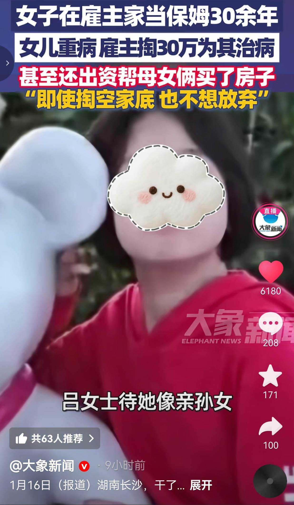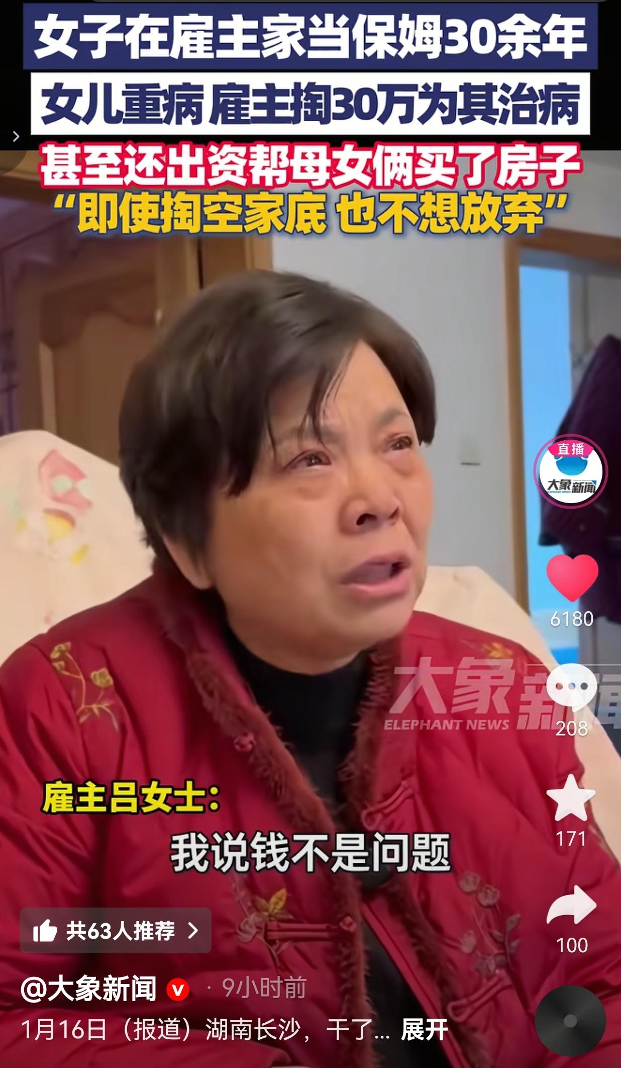 怎么会有这么好的雇主呢?保姆在雇主家干了30年,保姆女儿重病时雇主掏30万养老金给她救命,甚至还帮她们买了房。网友:这比亲生母亲做得还周到。 根据风芒新闻,1月14日的报道,湖南长沙,保姆蒋女士在雇主吕女士家勤恳工作30多年,早已和雇主一家亲如家人。 蒋女士的女儿航航从小残疾,雇主吕女士不仅没有嫌弃,反而待她取亲孙女。 在她得知航航突发重病、急需手术时,雇主吕女士不仅拿出自己30万的养老钱为其治病,还出钱帮母女俩买了房子,甚至还对保姆说:“即使掏空家底,也不能放弃”。 有时候蒋女士坚持不下去了,表现得很犹豫,雇主吕女士甚至半威胁保姆:“如果你敢放弃,我就把你从这里赶出去!” 网友看到后评论说:“看哭了!这哪里是雇主和保姆,分明就是血浓于水的家人啊!” 还有的网友说:“把养老钱都拿出来救孩子,还帮着买房,这是不为自己考虑,全为保姆和孩子考虑了,这才是刻在骨子里的善良!” 我们都说,现在很多人都讲究利益和算计,而雇主吕女士告诉我们:最好的关系,从来不是冷冰冰的雇佣,而是真心换真心。 保姆蒋女士用30多年的勤恳付出,看得出她对这个家的付出。吕女士毫不犹豫给保姆30万块钱的救命钱和一套房子,诠释了什么是大爱。 通过这事,这也让我们明白:真正的温暖,从来不是那层血缘关系,而是来自彼此的珍惜。 最后,希望我们每一个人都能遇到这样的“家人”,也愿我们都能成为这样的“家人”。