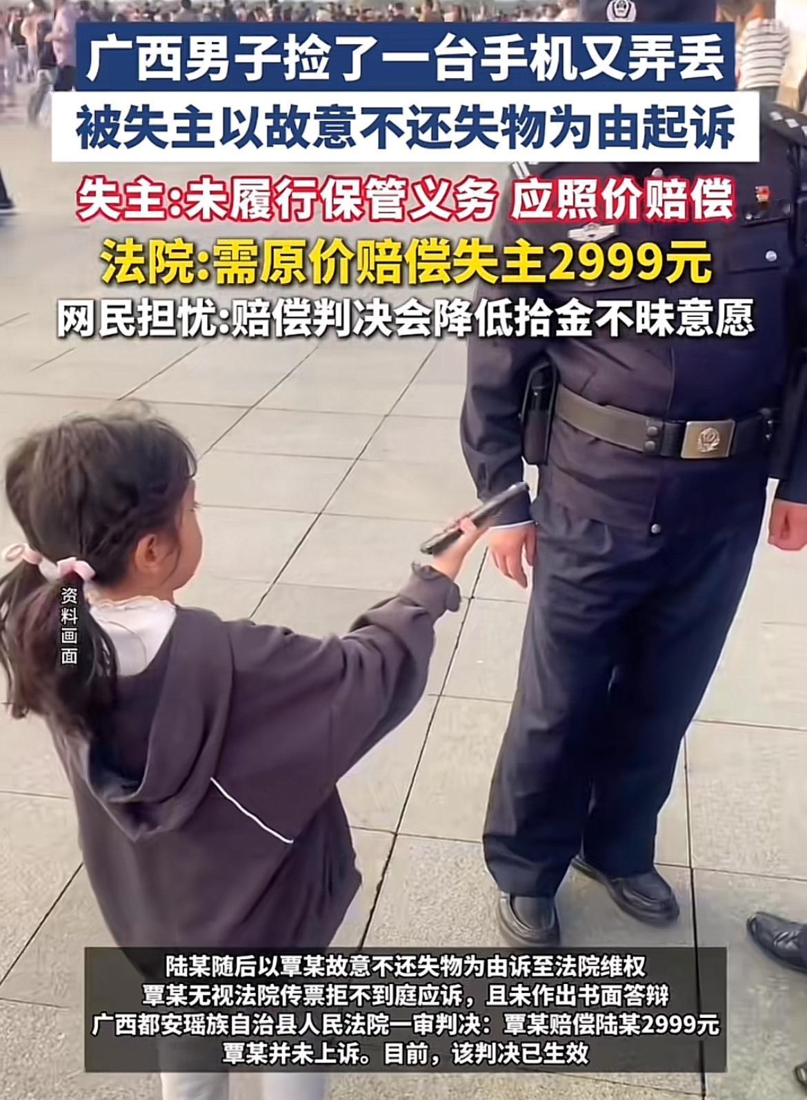 广西南宁这事儿挺有意思。男子陆某丢了手机,警方查到被覃某捡到。陆某去要,覃某说喝醉酒把手机遗失了。陆某觉得覃某没好好保管,要求照价赔,覃某拒绝。 陆某把覃某告上法庭,覃某无视传票不应诉也不答辩。法院认为,覃某拾得手机应返还或交有关部门,还得妥善保管,可他把手机放车头屉桶内,有重大过失。加上陆某买手机和丢手机间隔短,贬值可能性小,法院支持按2999元赔偿。覃某也没上诉,判决生效。这判决给大家提了个醒,捡到东西可得好好处理。