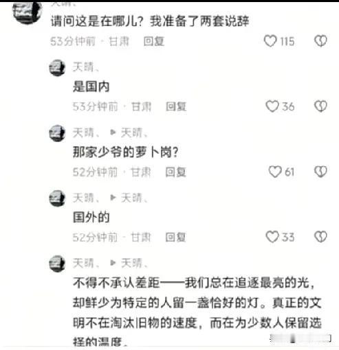 现在公知和大殖子也不好当了,广大网友已经非常了解公知和大殖子的话术了,有公知炫耀国外的路灯一到晚上都有专人点灯,网友直接在评论区自问自答,请问这是在哪里?我准备了两套说辞,如果是再国内的,就会说这是哪家少爷的萝卜岗,如果是在国外的,就会说不得不承认差距,我们总在追逐最亮的光,却鲜少为特定的人留一盏恰好的灯,真正的文明不再于淘汰旧物的速度,而在为少数人保留选择的温度! 不得不这位网友的公知风格的文笔,至少要读过十年以上的新四大名著,才可能有公知味满满的文笔,网友的水平都比公知要高这么多,你让公知还怎么玩下去!