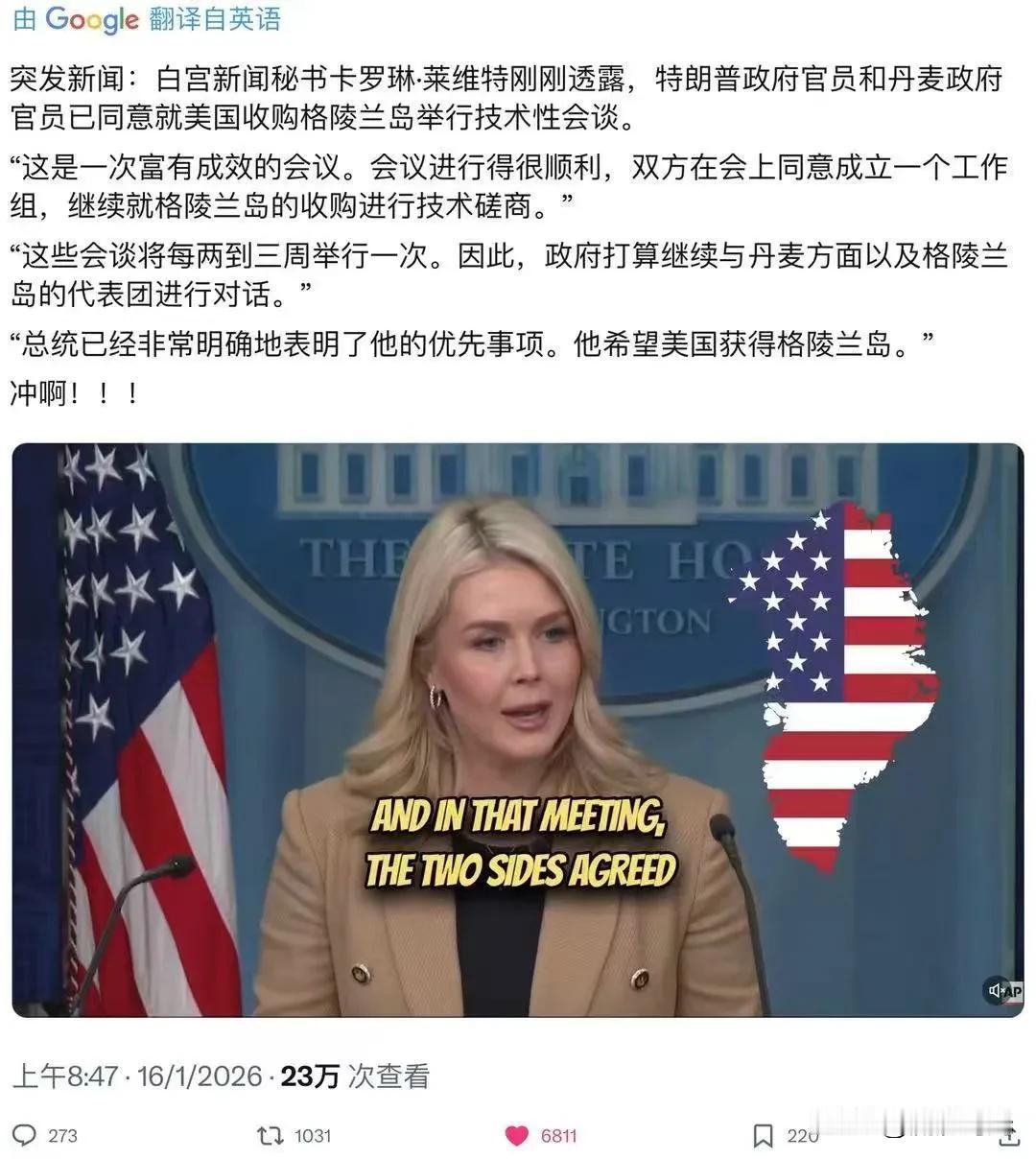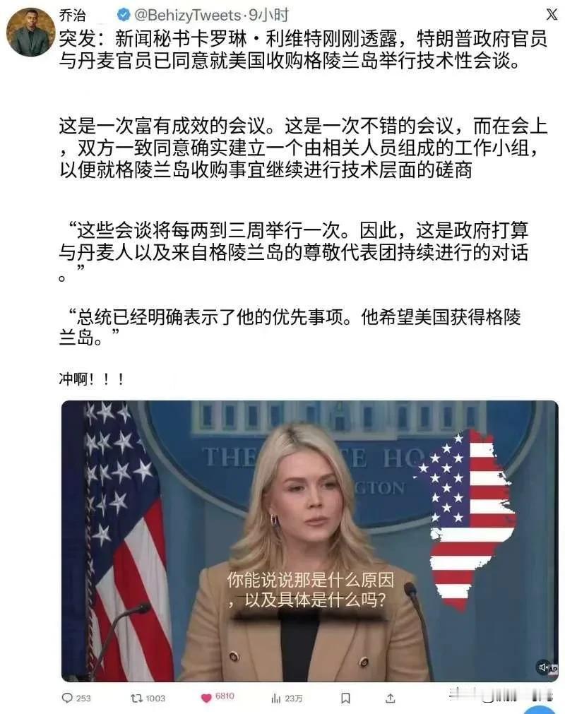 突发:白宫新闻秘书卡罗琳·莱维特刚刚透露,特朗普政府官员和丹麦政府官员已同意就美国收购格陵兰岛举行技术性会谈。“这是一次富有成效的会议。会议进行得很顺利,双方在会上同意成立一个工作组,继续就格陵兰岛的收购进行技术磋商。”“这些会谈将每两到三周举行一次。因此,政府打算继续与丹麦方面以及格陵兰岛的代表团进行对话。”“总统已经非常明确地表明了他的优先事项。他希望美国获得格陵兰岛。”冲啊!!!