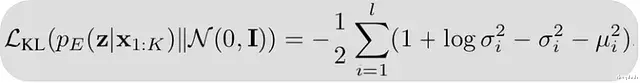 KL 组件惩罚编码器的高斯后验 pE(z ∣x)(由其均值和方差参数化)与固定先验 N(0,I ) 之间的散度,从而鼓励每个输入的潜在表示遵循该先验分布,公式摘自原始 CALM 论文。