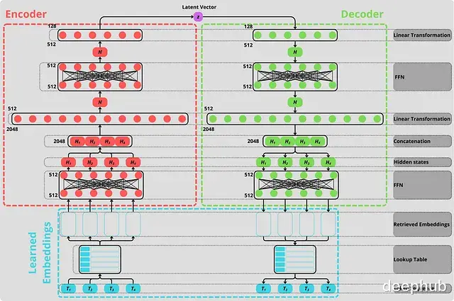 CALM 中提出的自编码器的完整架构,正如我们所看到的,编码器(红色)和解码器(绿色)是镜像,一个用于生成潜在空间,另一个用于解码它。从这个意义上说,这个自编码器是创新的,因为它学习表示比token更高的语义单元,学习自己的token嵌入(蓝色)。图片由作者创建。