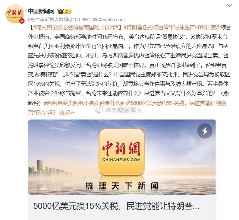 特朗普任内将台湾半导体生产40%迁美 川总能不能加加油,把湾湾半导体生产产能的50%、80%或百分百都迁到美国去?如果这样的话,蔡元、郭亮、陈馨等人骄傲心理就更少了,湾湾普通民众拒统的心理也不会那么强烈了岛内舆论忧心台湾被美国吃干抹尽,热点观点 ,台积电变美积电不是卖台是什么(新闻来源图1)